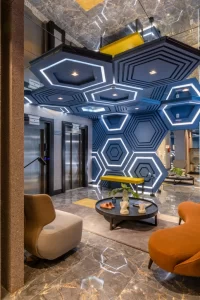 A CASACOR de 2020 teve formato híbrido, com exposições no Balneário Shopping e online. O ambiente “The Ring Light Room” combina funcionalidade e estética com espelhos iluminados, tons de azul e verde, e linhas curvas, ideal para uma influenciadora digital.