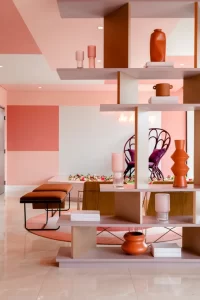 La Dolce Vita usa tons pastéis e iluminação para uma atmosfera lúdica que remete à infância e felicidade, com elementos geométricos modernos.