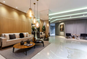 Assim como o Lago di Como, localizado na Itália, com um cenário encantador que contrapõe as belezas naturais do lago com seus centros urbanos, o novo empreendimento da Santana Construtora faz essa analogia, contrastando a fachada com as áreas comuns do edifício.