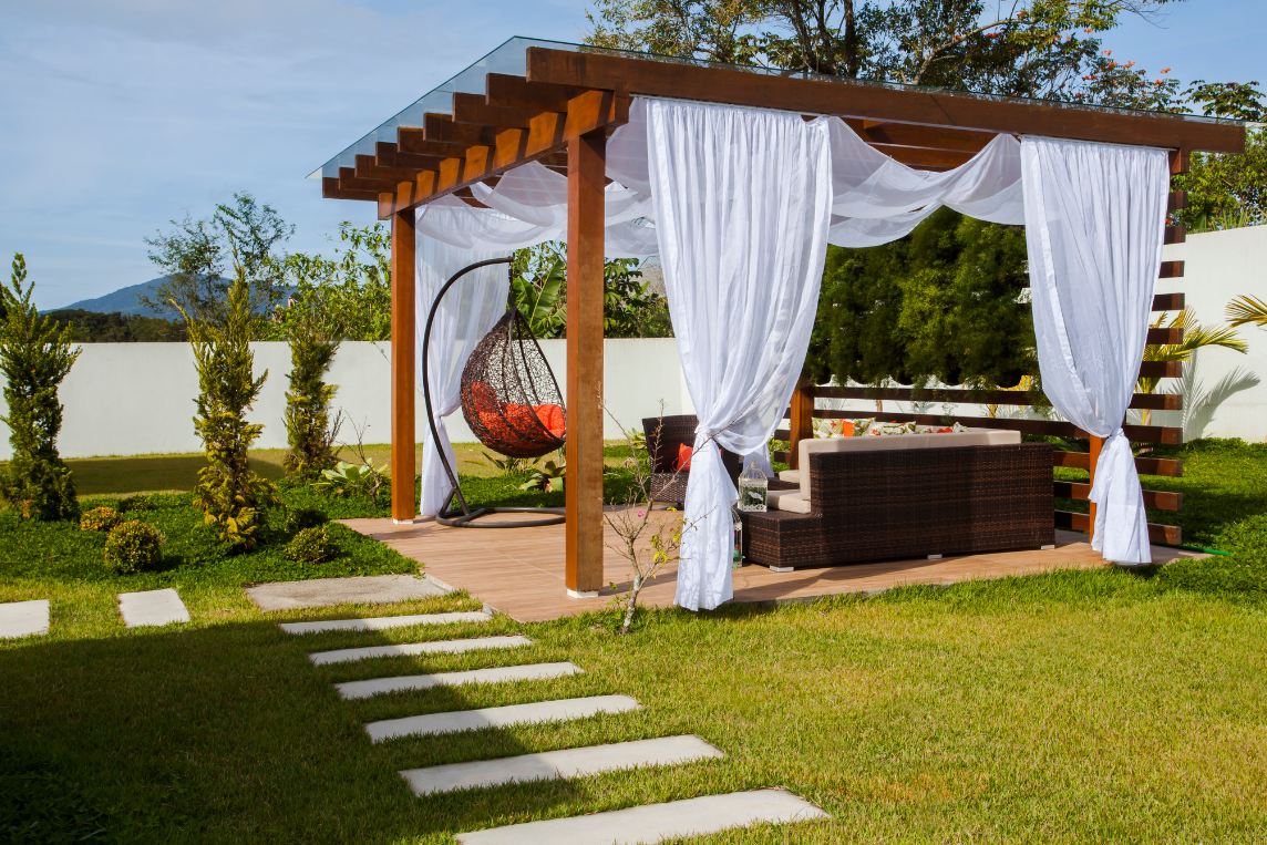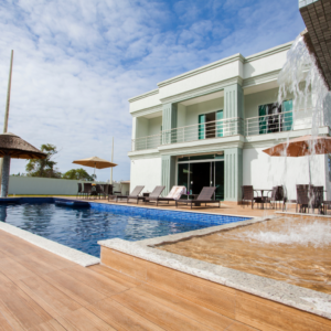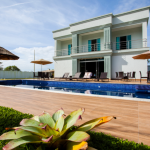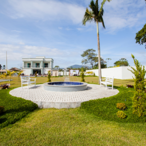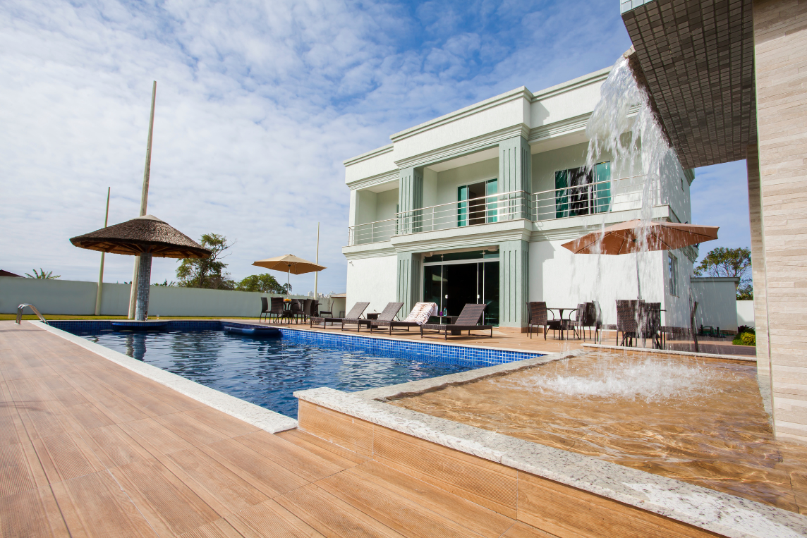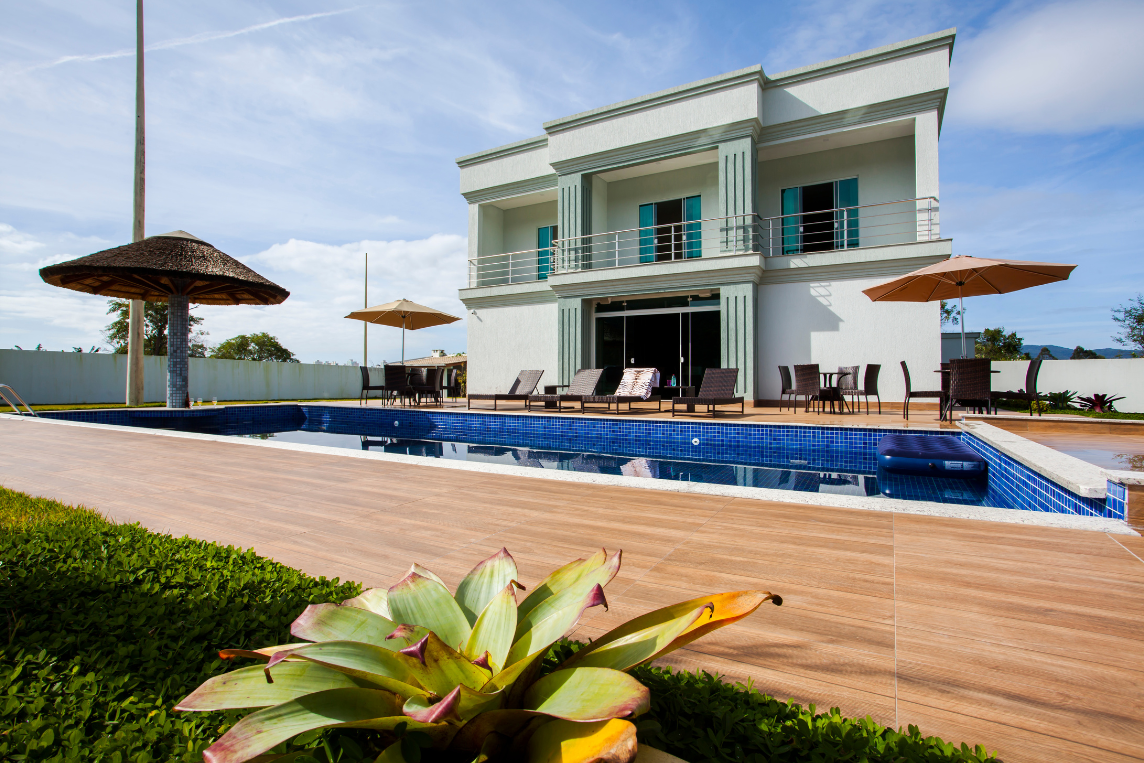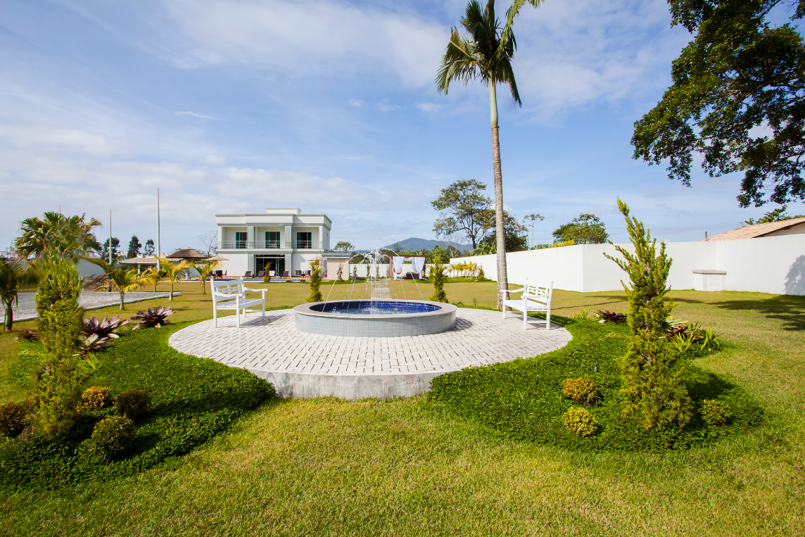 Uma casa ampla, leve e arejada. O destaque fica por conta do jardim, que possui espaço zen, chafariz e uma grande piscina com cascata.