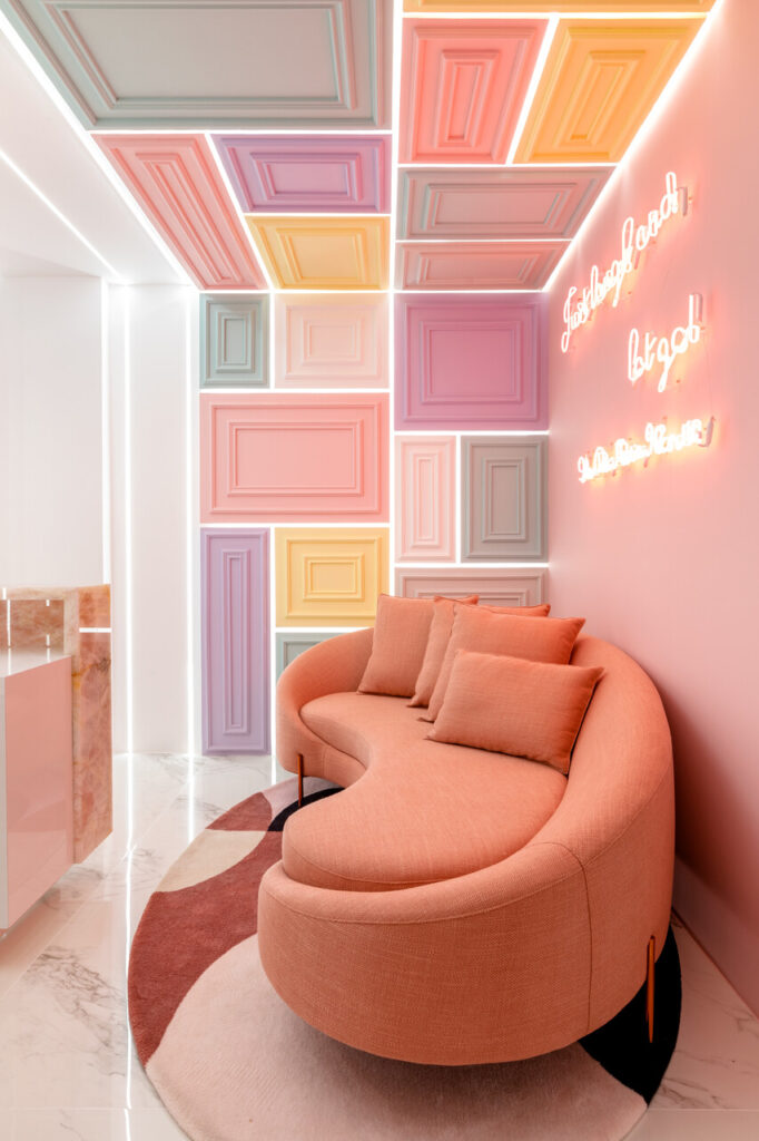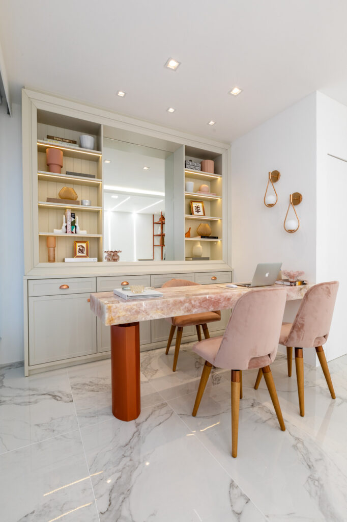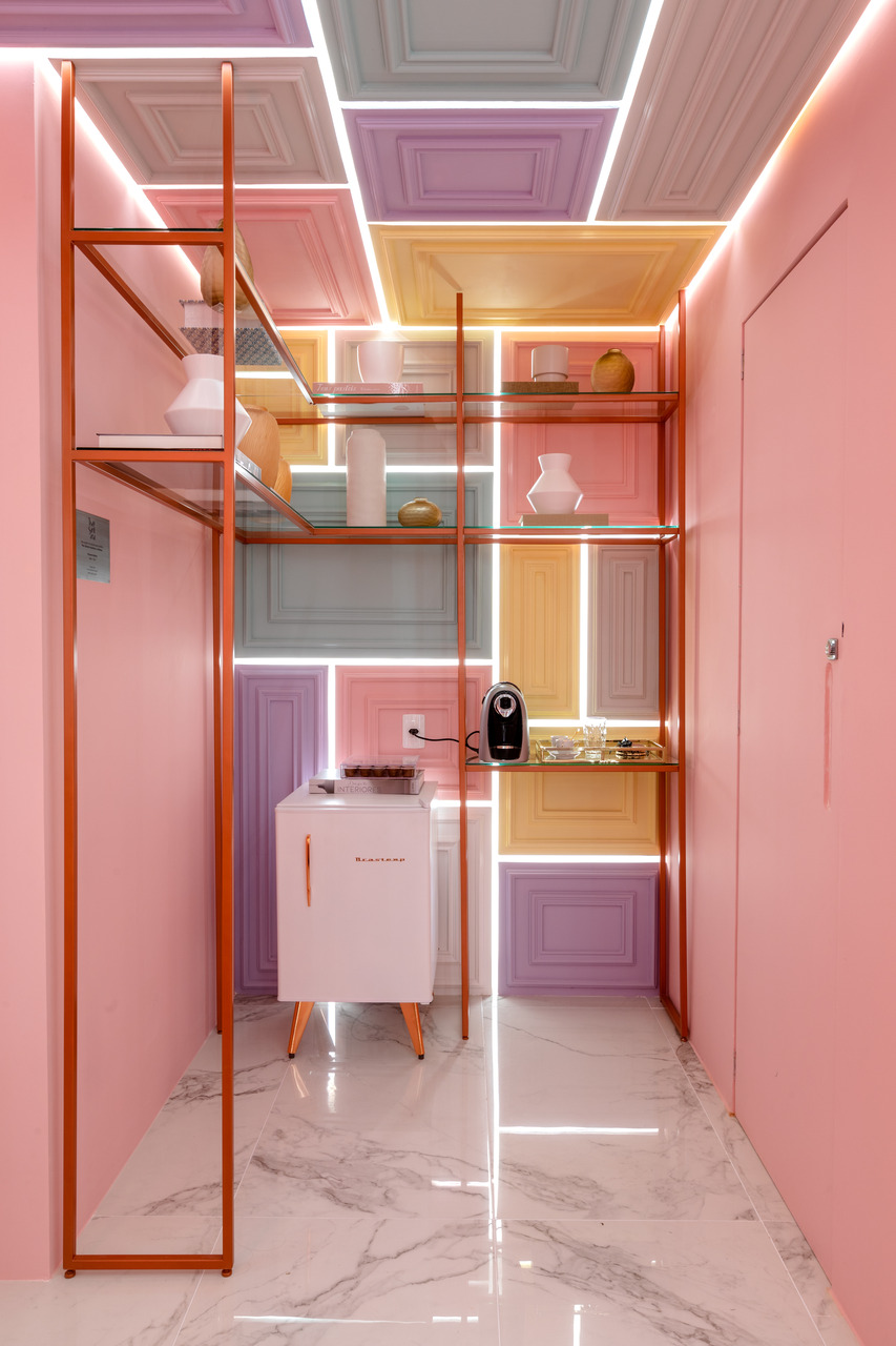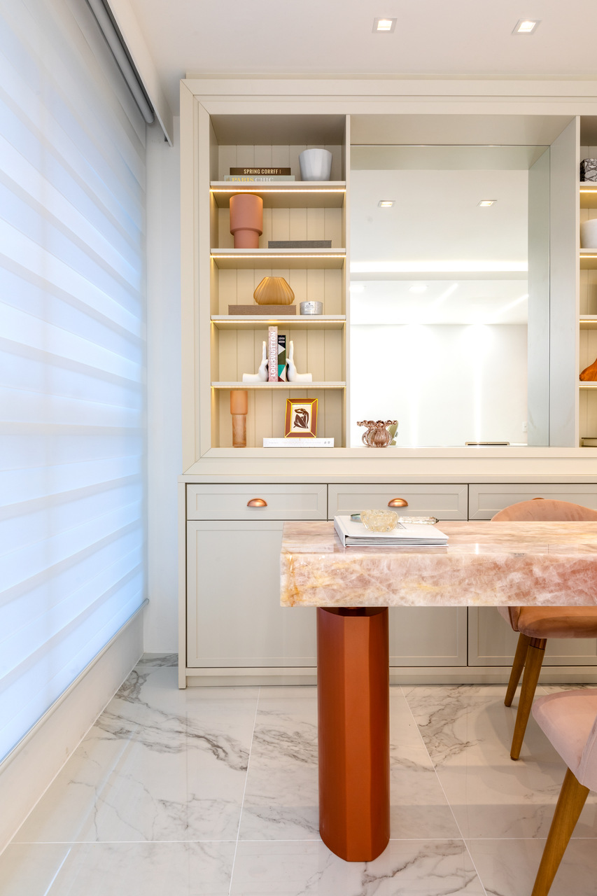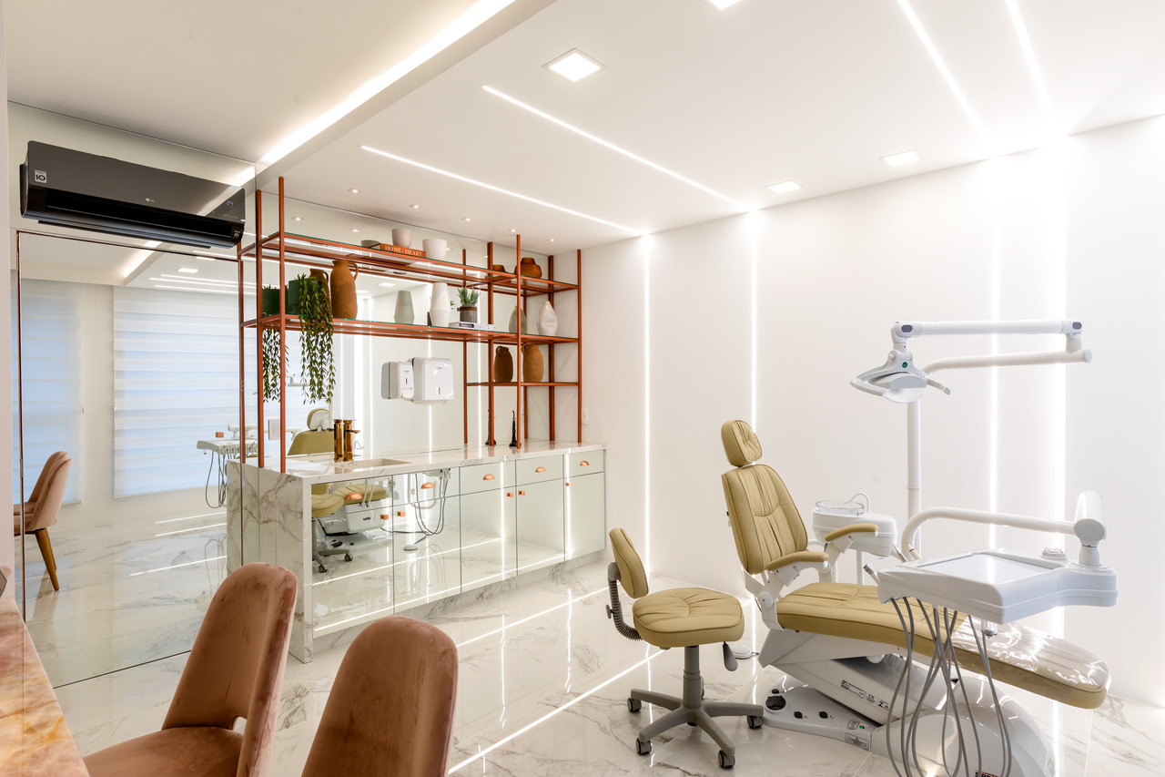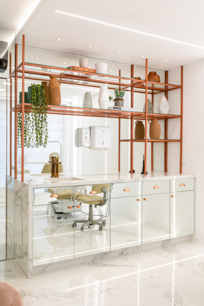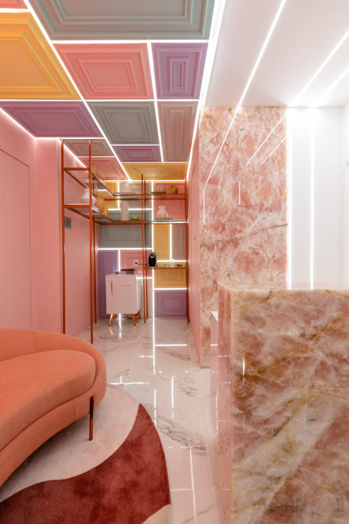 Contemporâneo, ousado e elegante. Essas foram as palavras-chave que nortearam a proposta da Clínica Ana Flávia Moretti, em Joinville. Trabalhando os três elementos de forma conjunta, o desafio era encontrar um meio de combinar tons e texturas incomuns, deixando os ambientes harmônicos e lúdicos, sem perder a elegância. Para tanto foram utilizadas a pedra translúcida rosa, a estrutura metálica na cor cobre e perfis de iluminação que se relacionam com o grande foco do projeto na recepção: as molduras clássicas interpretadas de uma forma contemporânea, apostando na assimetria e nuances diversas, todas em tons pastéis.