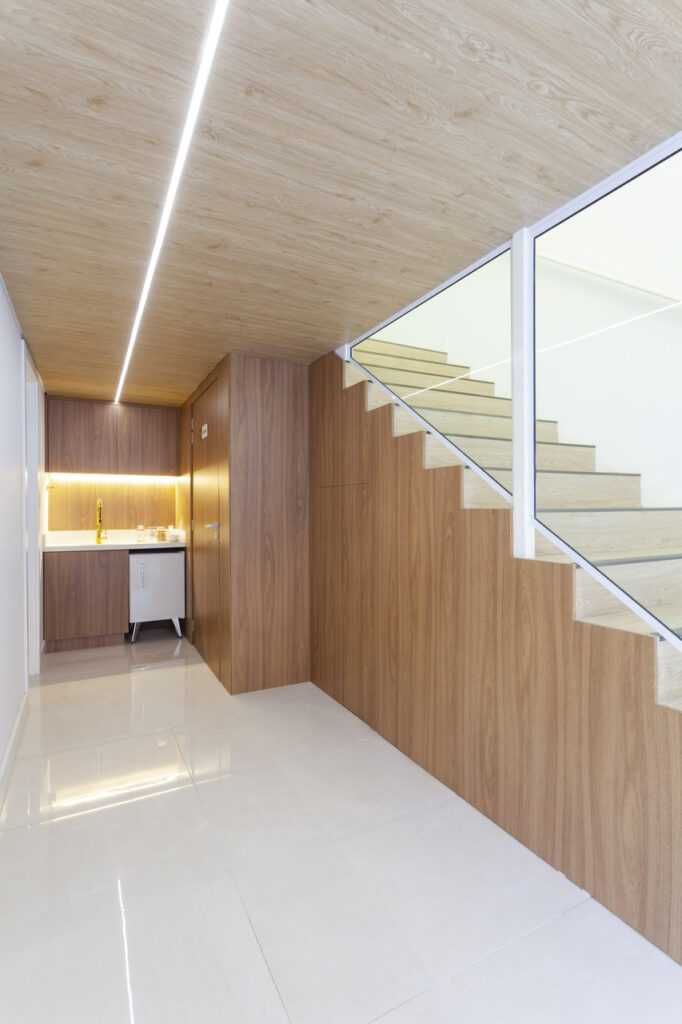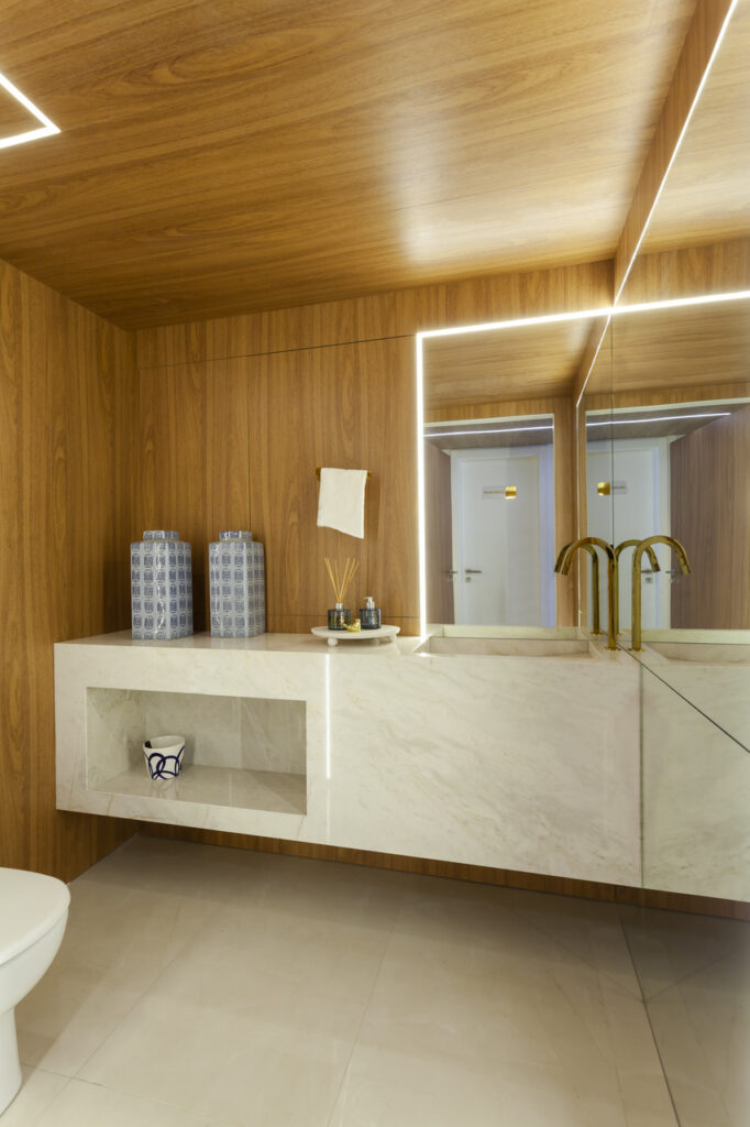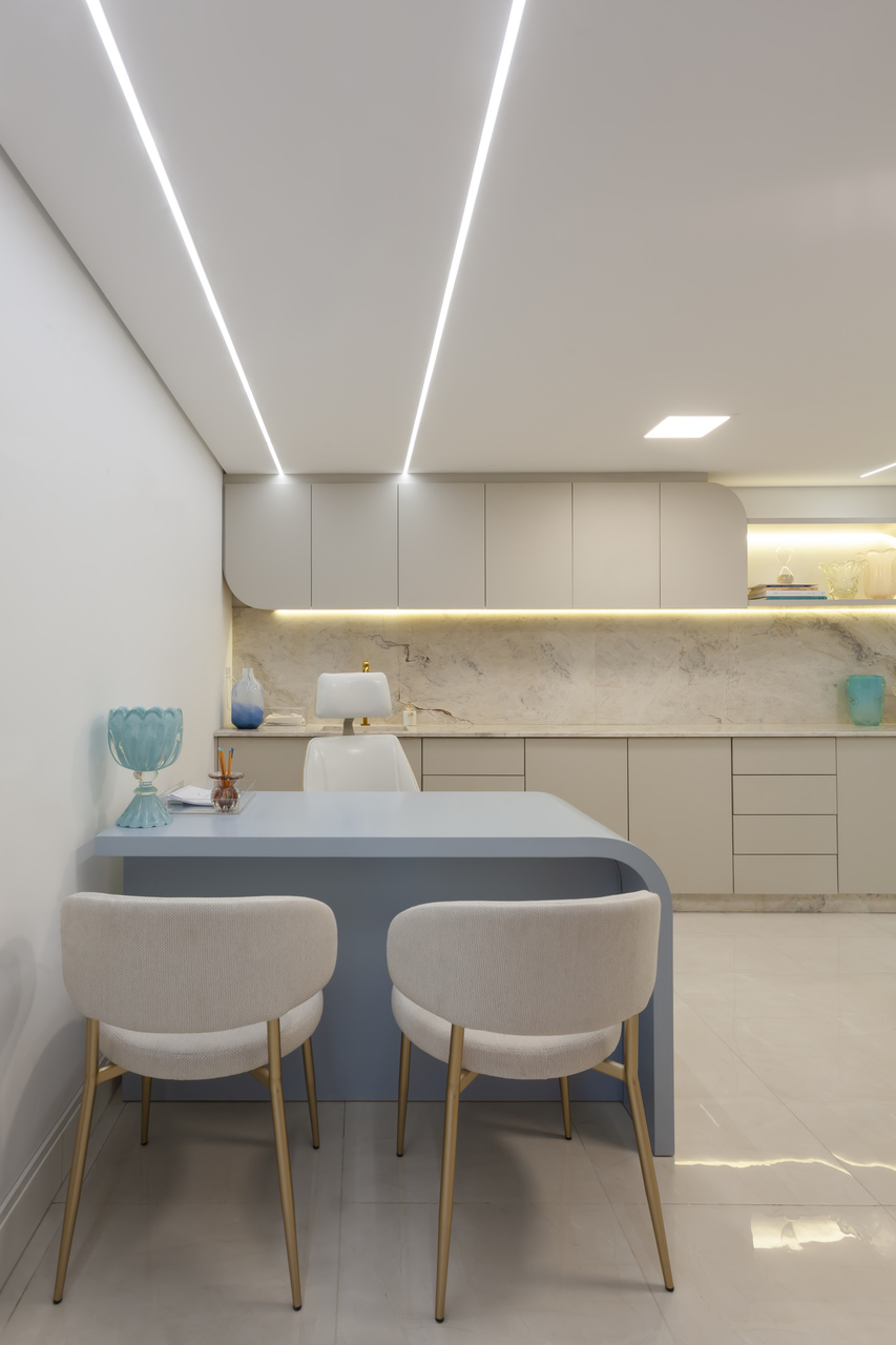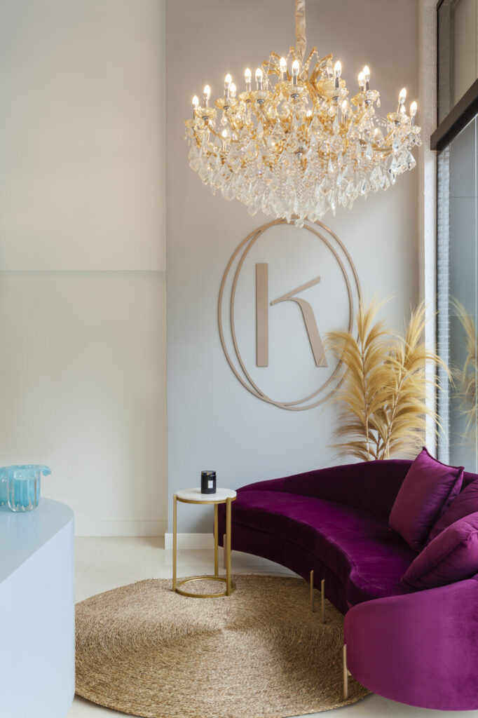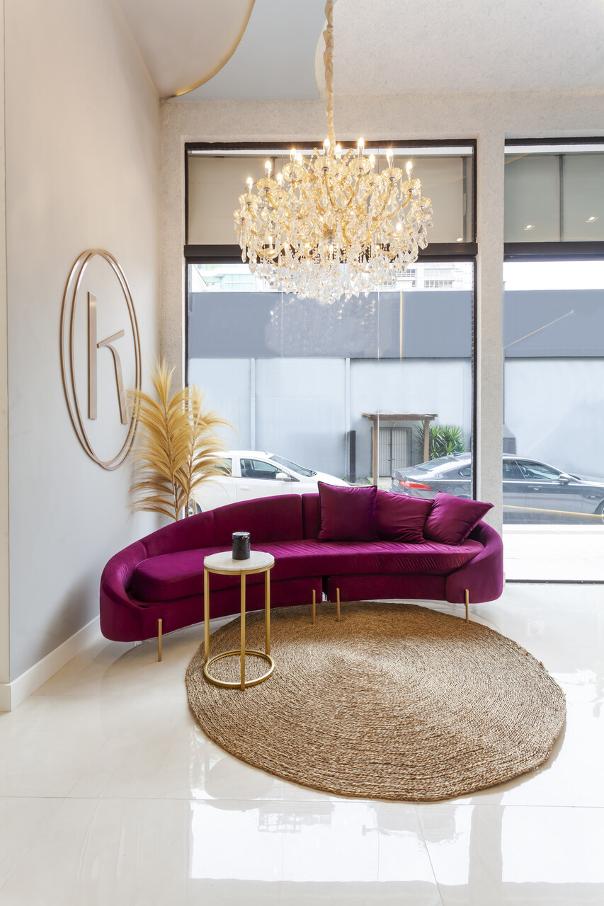 O grande destaque é o contraste entre a base neutra — com tons claros e acabamento minimalista — e os elementos de personalidade, como o sofá curvo em veludo magenta e o imponente lustre de cristal, que adiciona requinte e protagonismo ao ambiente. A marcenaria fluida e o balcão com linhas suaves reforçam a linguagem arquitetônica moderna, enquanto os detalhes em dourado e a iluminação cênica trazem aconchego e exclusividade.