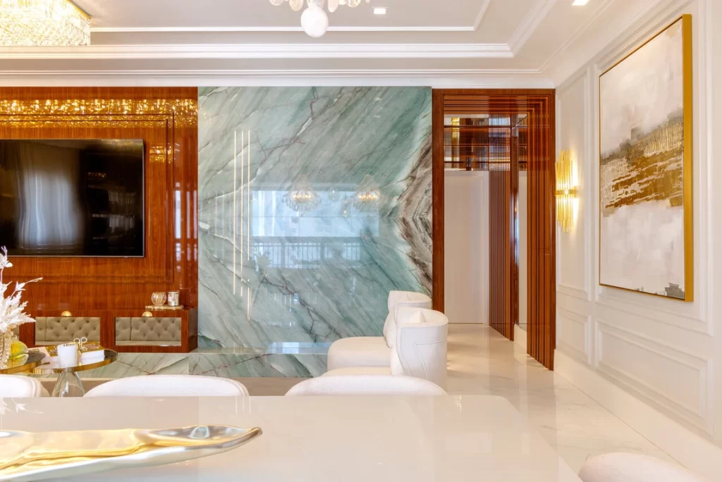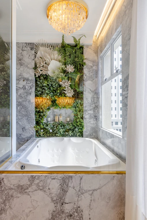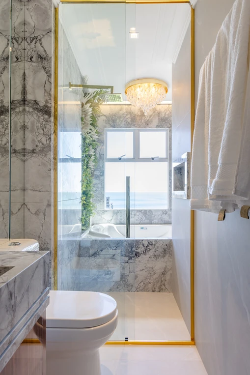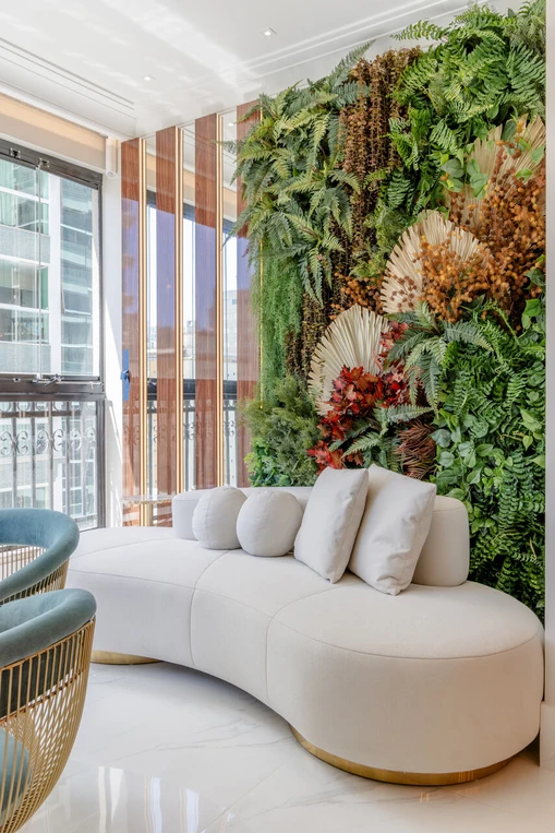 Seguindo a linha contemporânea da fachada essa foi a premissa para seguir as áreas de lazer internamente, as principais cores utilizadas foi azul e verde trazendo esta atmosfera de praia ao seu interior, sem perder a ousadias nas cores e formas, algo que sempre incorporamos aos nossos projetos, ficou evidente já no hall de entrada aonde a forma hexagonal começa na parede subindo até o teto, os tons de terra cota e amarelo completam a paleta que escolhida para esse empreendimento.