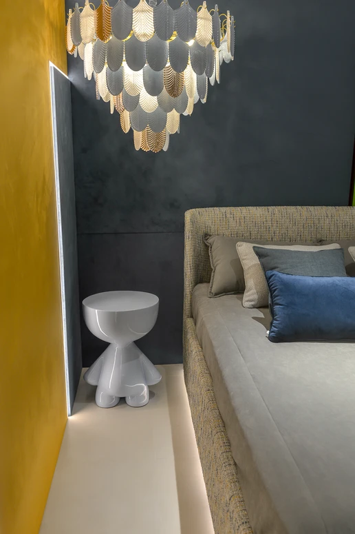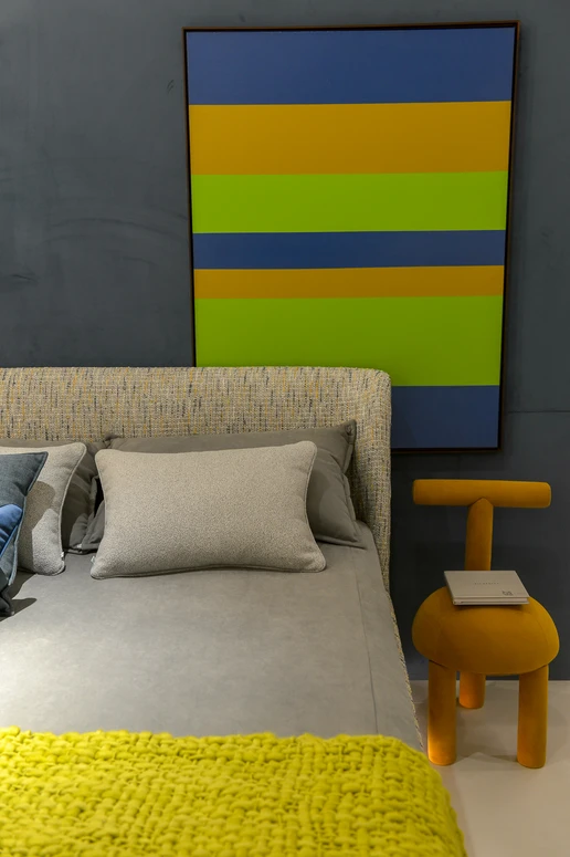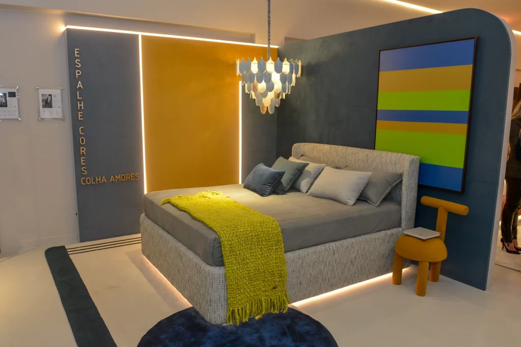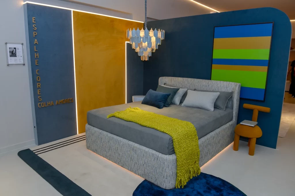Espalhe cores, colha amores. Seguindo a ousadia das cores que amamos trabalhar em nossos projetos, apresentamos um quarto policromático e arrojado, aliados ao conforto e sofisticação indispensáveis em um espaço de descanso. Trouxemos tons, formas e texturas dispostas de diversas maneiras, seja nas curvas do tapete, no tweed da cama, ou nas formas retangulares aplicadas com veludo e combinadas com iluminação, se complementando de forma harmônica e proporcionando um aspecto de ludicidade ao ambiente.