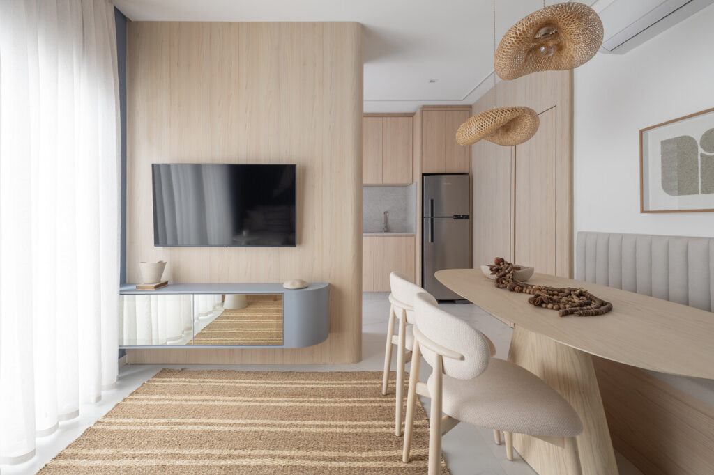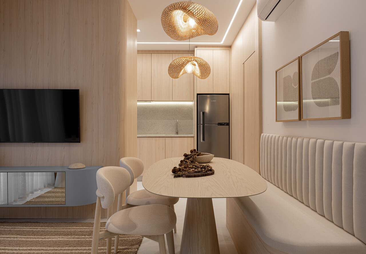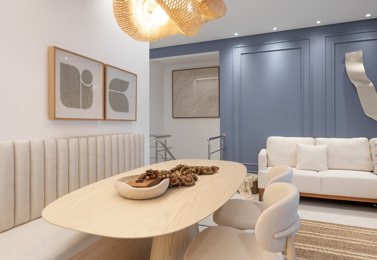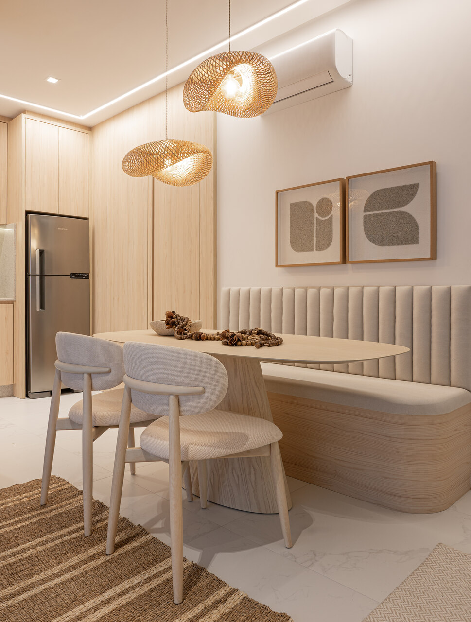 A integração entre estar, jantar e cozinha reforça a fluidez dos espaços, como um ambiente que respira e se conecta de forma natural. A marcenaria em destaque, com nichos iluminados, traz profundidade e um toque contemporâneo, enquanto os pendentes em fibras naturais acrescentam textura e reforçam o conceito praiano.