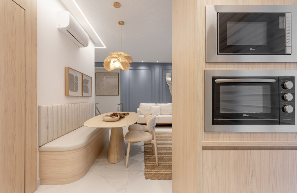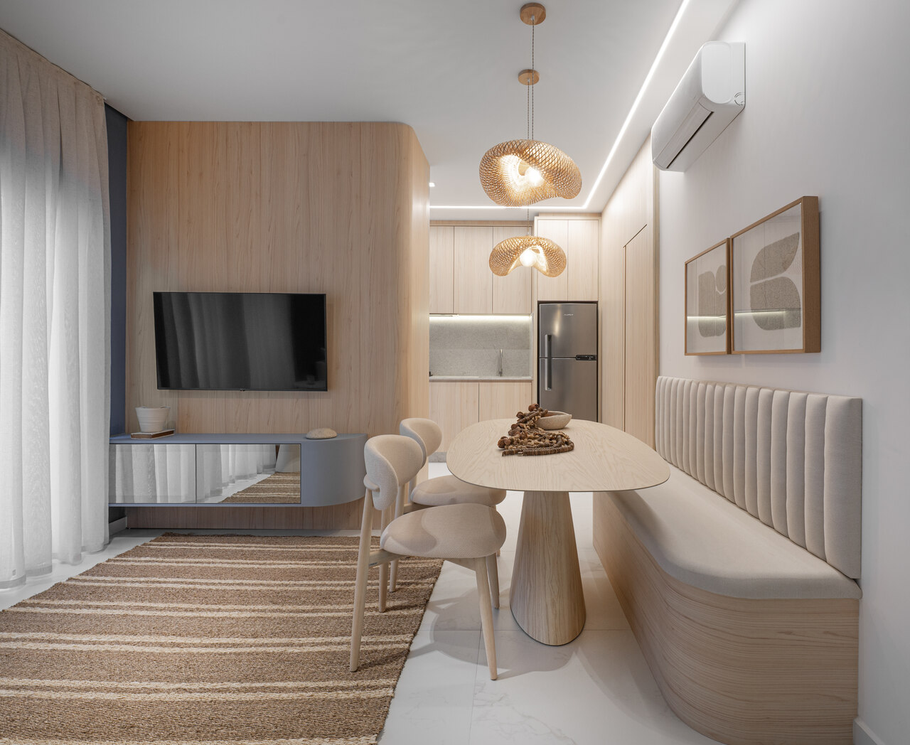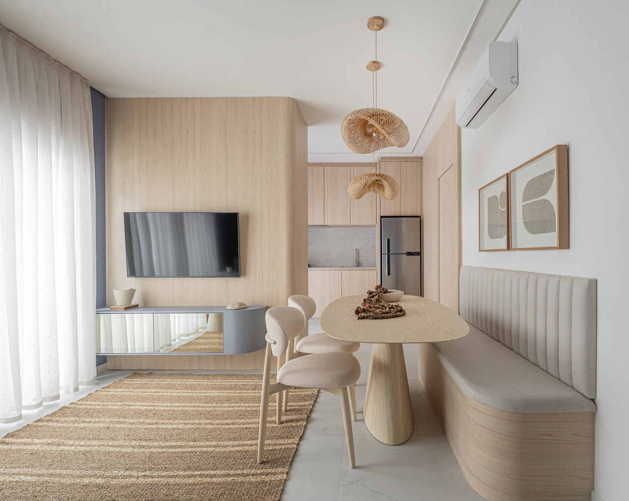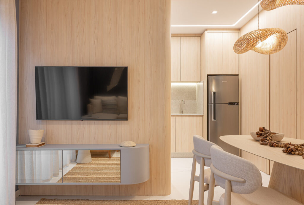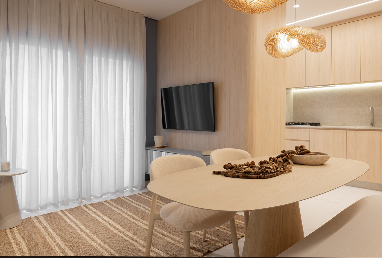 A integração entre estar, jantar e cozinha reforça a fluidez dos espaços, como um ambiente que respira e se conecta de forma natural. A marcenaria em destaque, com nichos iluminados, traz profundidade e um toque contemporâneo, enquanto os pendentes em fibras naturais acrescentam textura e reforçam o conceito praiano.