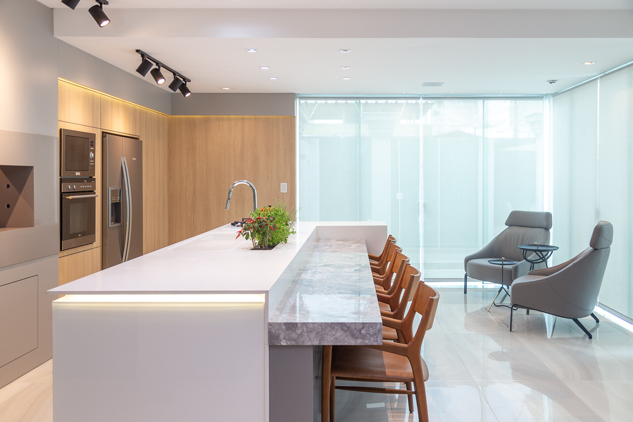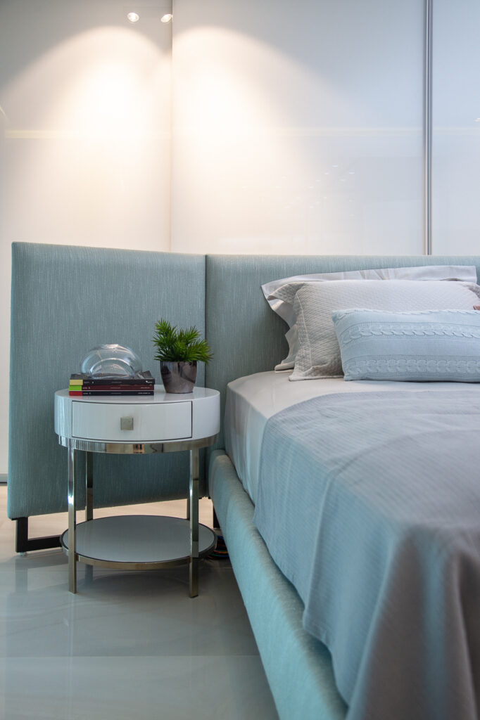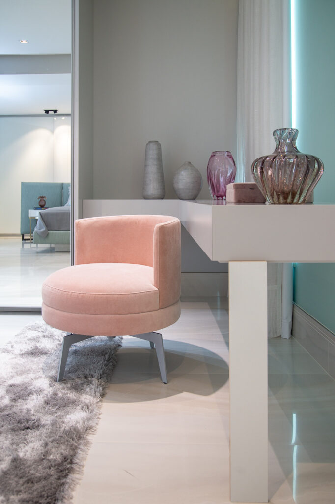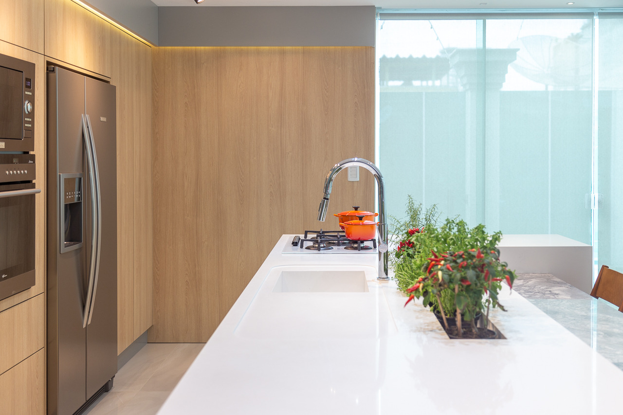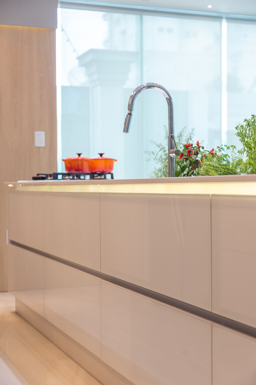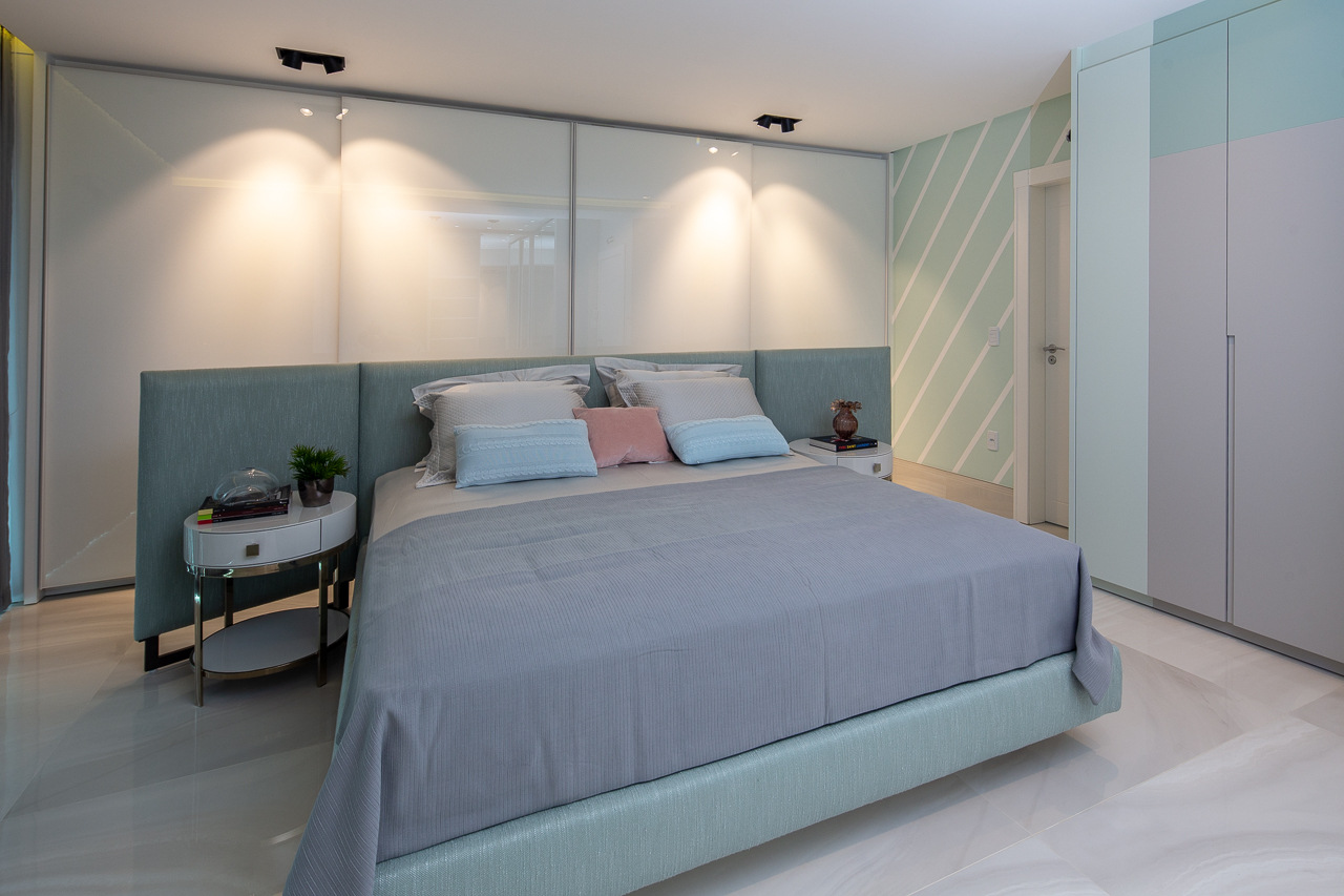 Delicadeza e elegância na suíte do casal. Neste projeto, apostamos nos tons neutros e pastel. A cama ganha destaque no centro do quarto e deixa o ambiente mais amplo e otimizado, além disso, foi realizado o projeto também da cozinha, que se da . destaque para o painel de madeira onde ficam os armários e eletrodomésticos, a bancada com pequena horta e também a bancada para lanche em mármore que dão acabamento especial ao projeto.