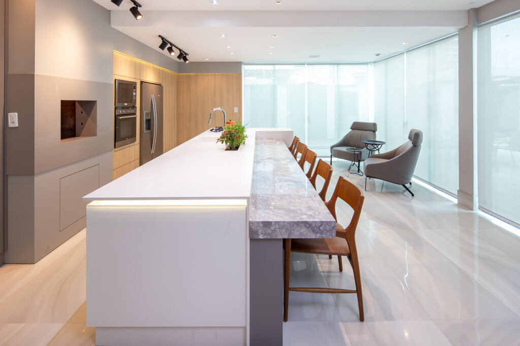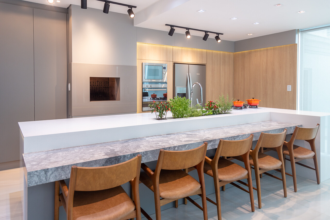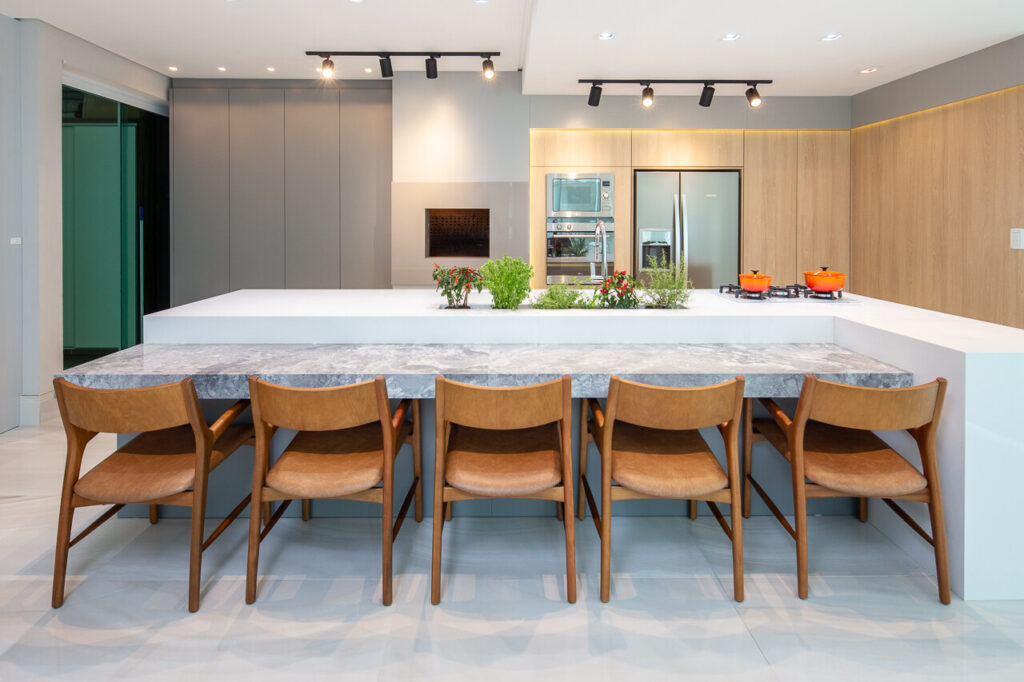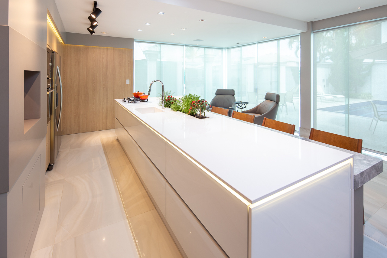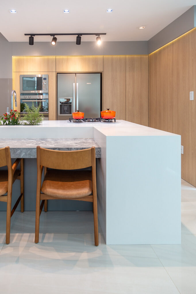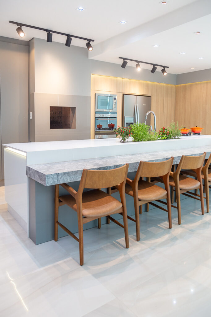 Delicadeza e elegância na suíte do casal. Neste projeto, apostamos nos tons neutros e pastel. A cama ganha destaque no centro do quarto e deixa o ambiente mais amplo e otimizado, além disso, foi realizado o projeto também da cozinha, que se da . destaque para o painel de madeira onde ficam os armários e eletrodomésticos, a bancada com pequena horta e também a bancada para lanche em mármore que dão acabamento especial ao projeto.