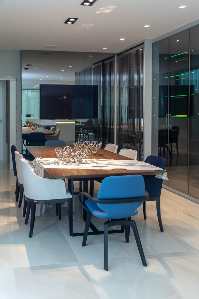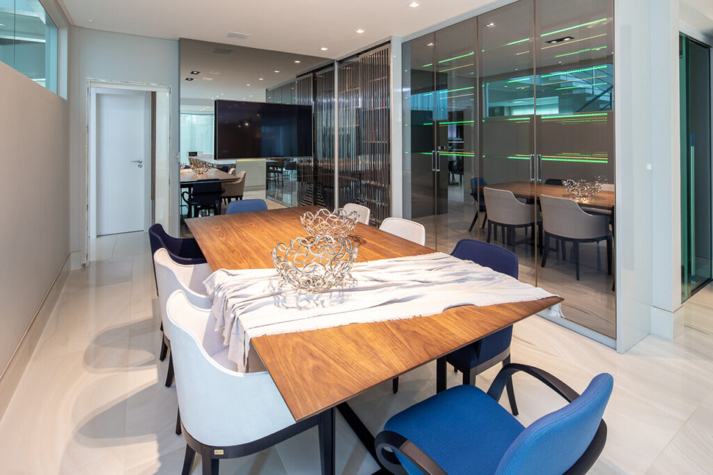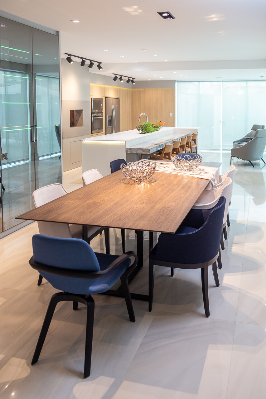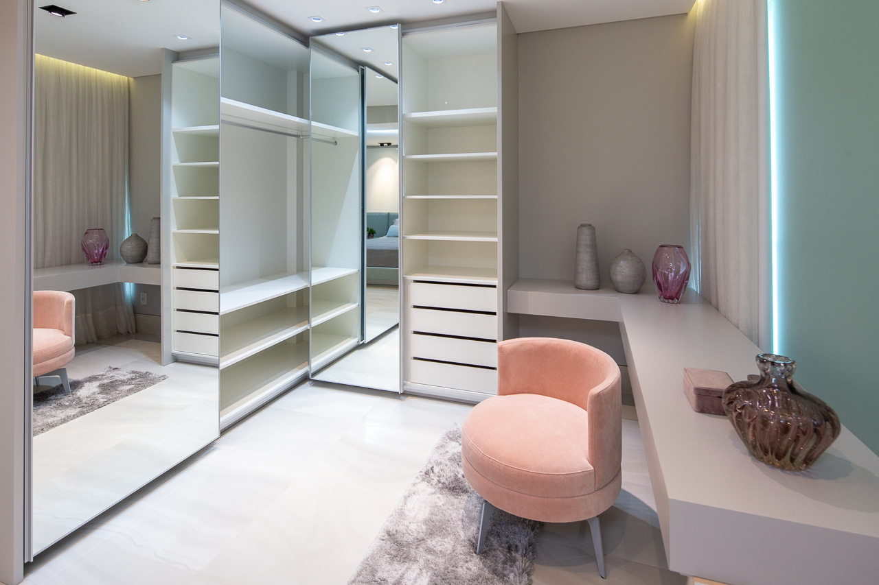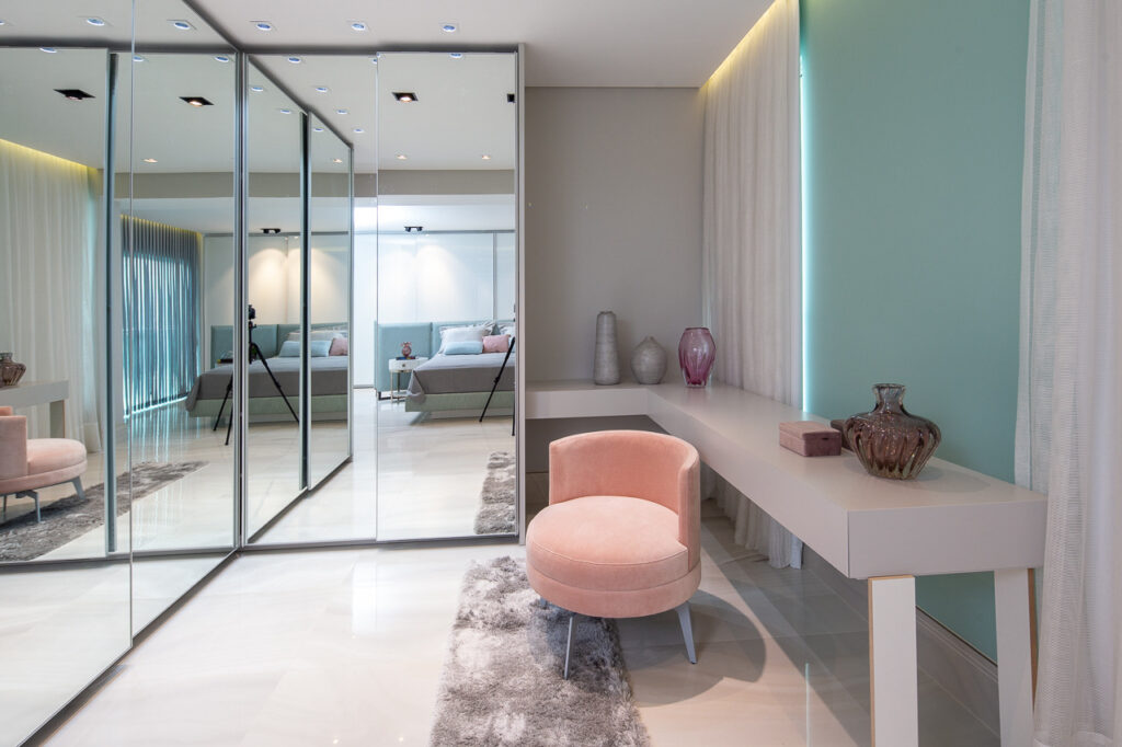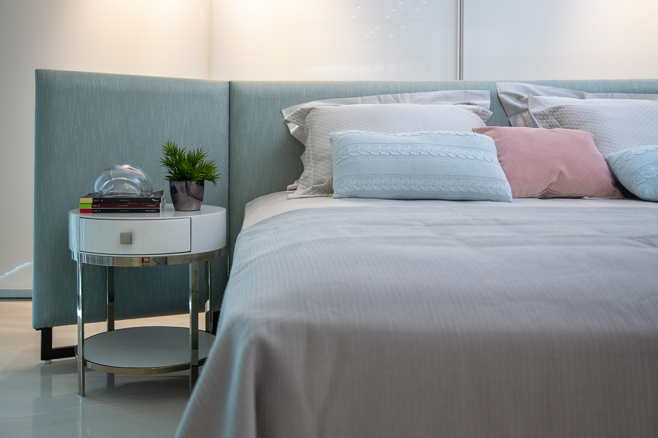 Delicadeza e elegância na suíte do casal. Neste projeto, apostamos nos tons neutros e pastel. A cama ganha destaque no centro do quarto e deixa o ambiente mais amplo e otimizado, além disso, foi realizado o projeto também da cozinha, que se da . destaque para o painel de madeira onde ficam os armários e eletrodomésticos, a bancada com pequena horta e também a bancada para lanche em mármore que dão acabamento especial ao projeto.