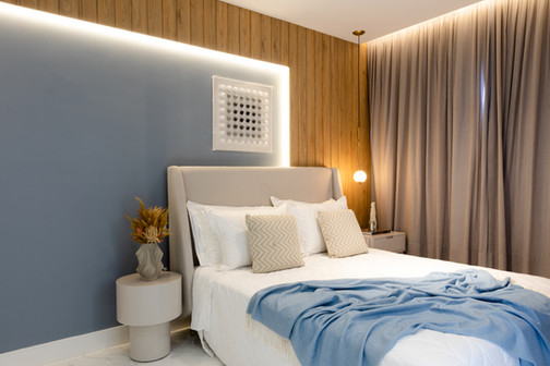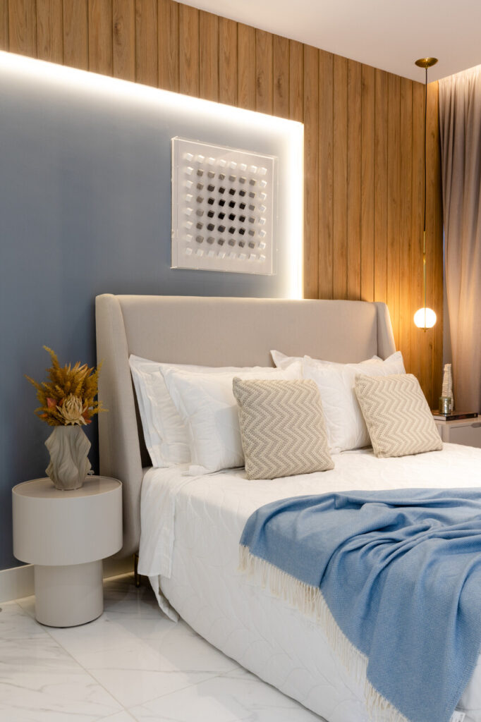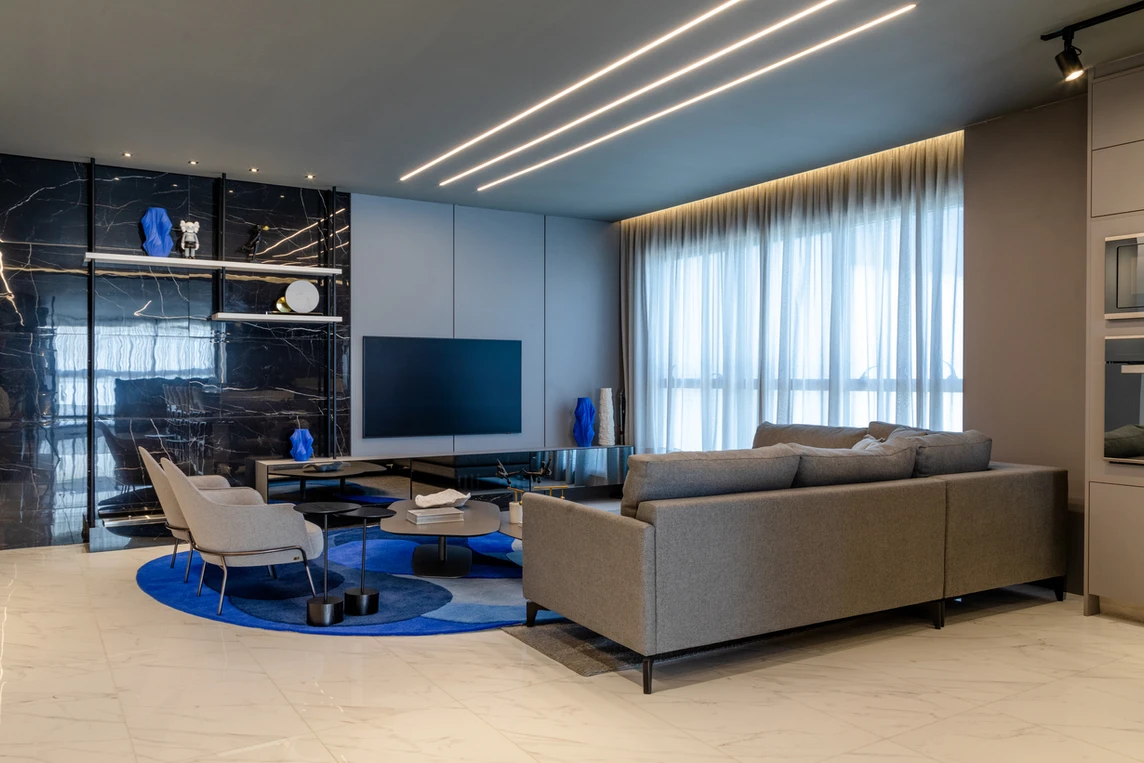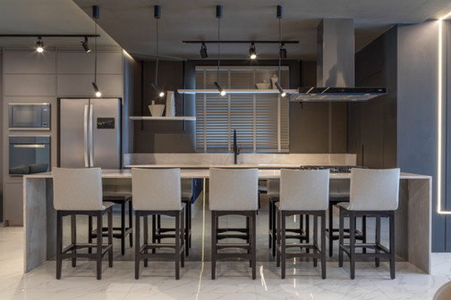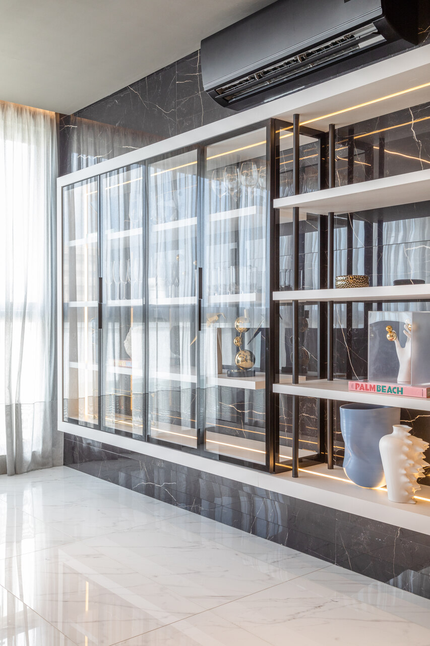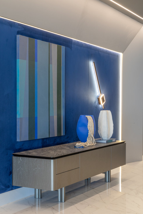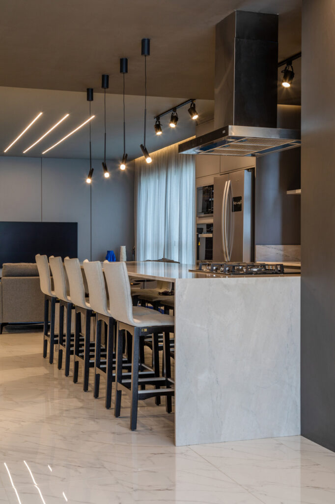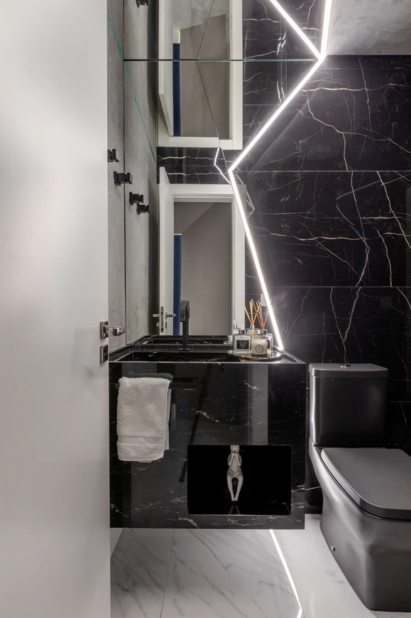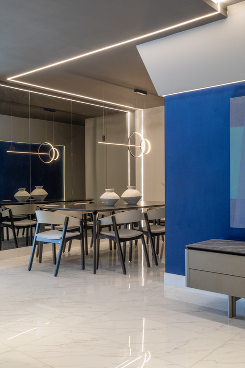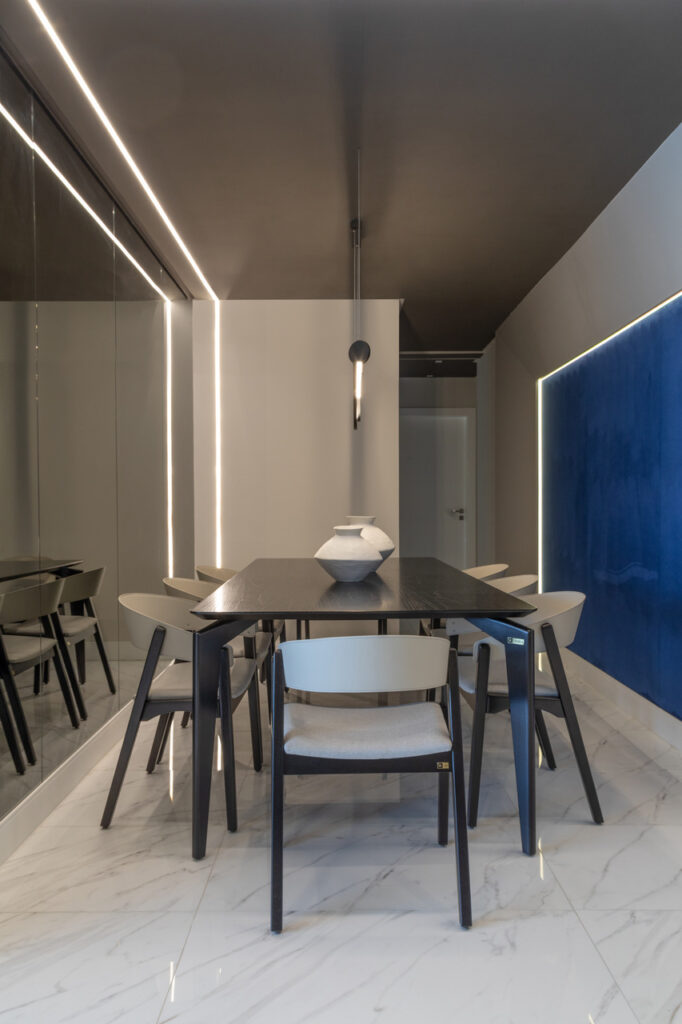 Este espaço teve como premissa a contemporaneidade de forma singular, com a utilização de uma paleta cinza combinada com tons de azul intenso que se destacam no ambiente, além do porcelanato preto Nero Venato, criando um ambiente perfeito para receber os amigos. O azul também se destaca nas diferentes texturas, como na aplicação do veludo azul na parede, emoldurada com um painel com ângulo inclinado. Além disso, a iluminação aparece com bastante relevância através dos perfis de led, que se conectam entre os ambientes, das arandelas e pendentes singulares e dos painéis com iluminação indireta.