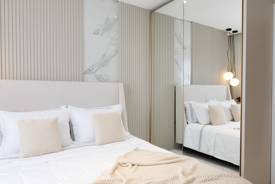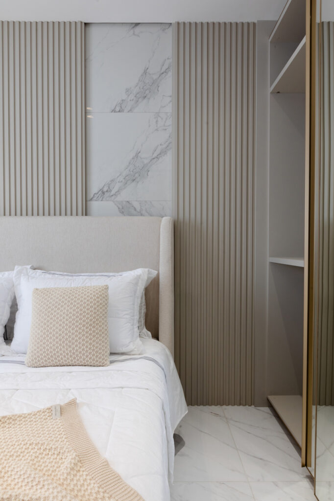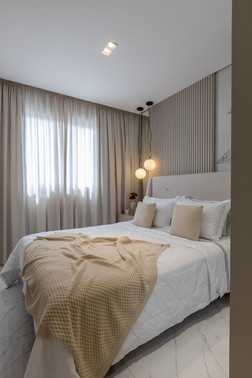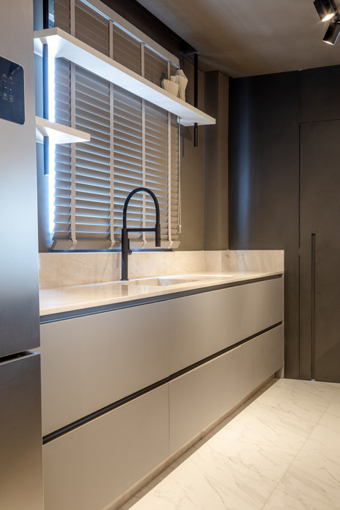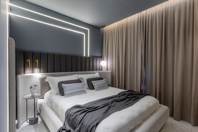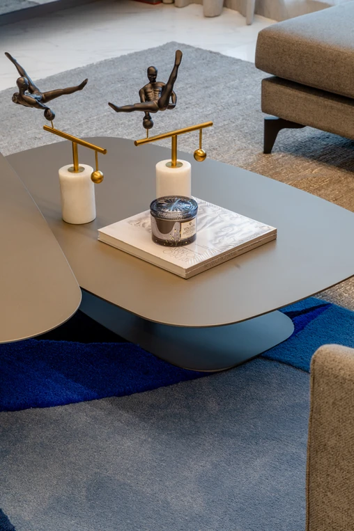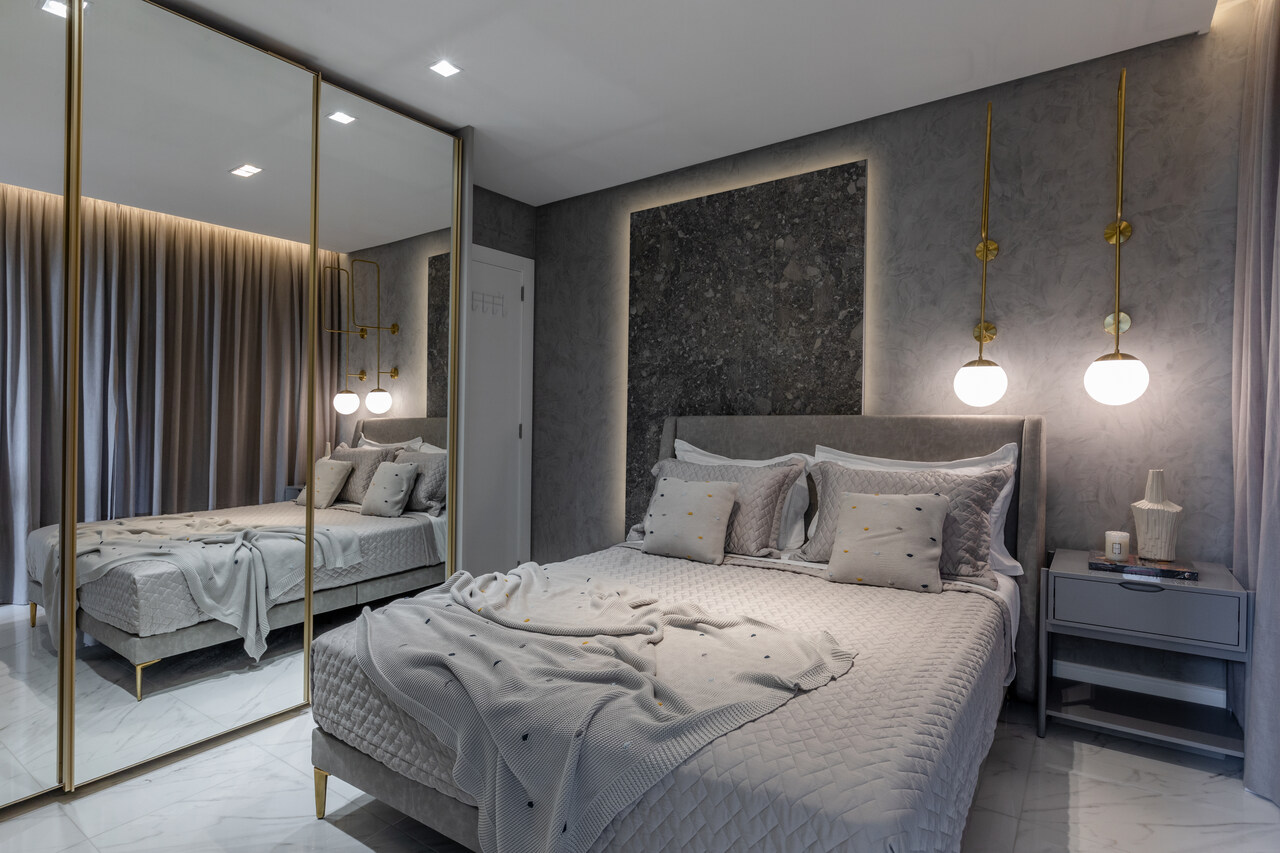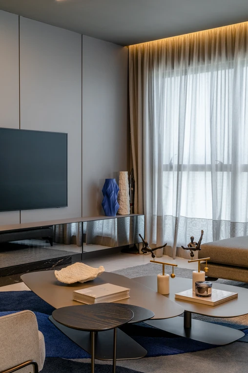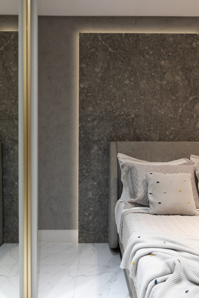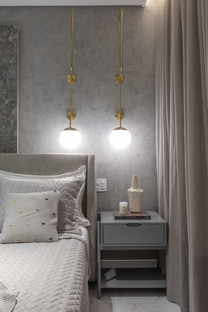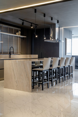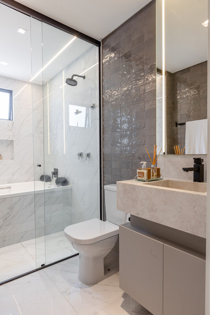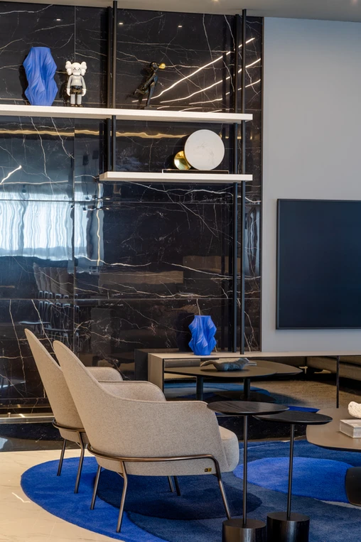 Este espaço teve como premissa a contemporaneidade de forma singular, com a utilização de uma paleta cinza combinada com tons de azul intenso que se destacam no ambiente, além do porcelanato preto Nero Venato, criando um ambiente perfeito para receber os amigos. O azul também se destaca nas diferentes texturas, como na aplicação do veludo azul na parede, emoldurada com um painel com ângulo inclinado. Além disso, a iluminação aparece com bastante relevância através dos perfis de led, que se conectam entre os ambientes, das arandelas e pendentes singulares e dos painéis com iluminação indireta.