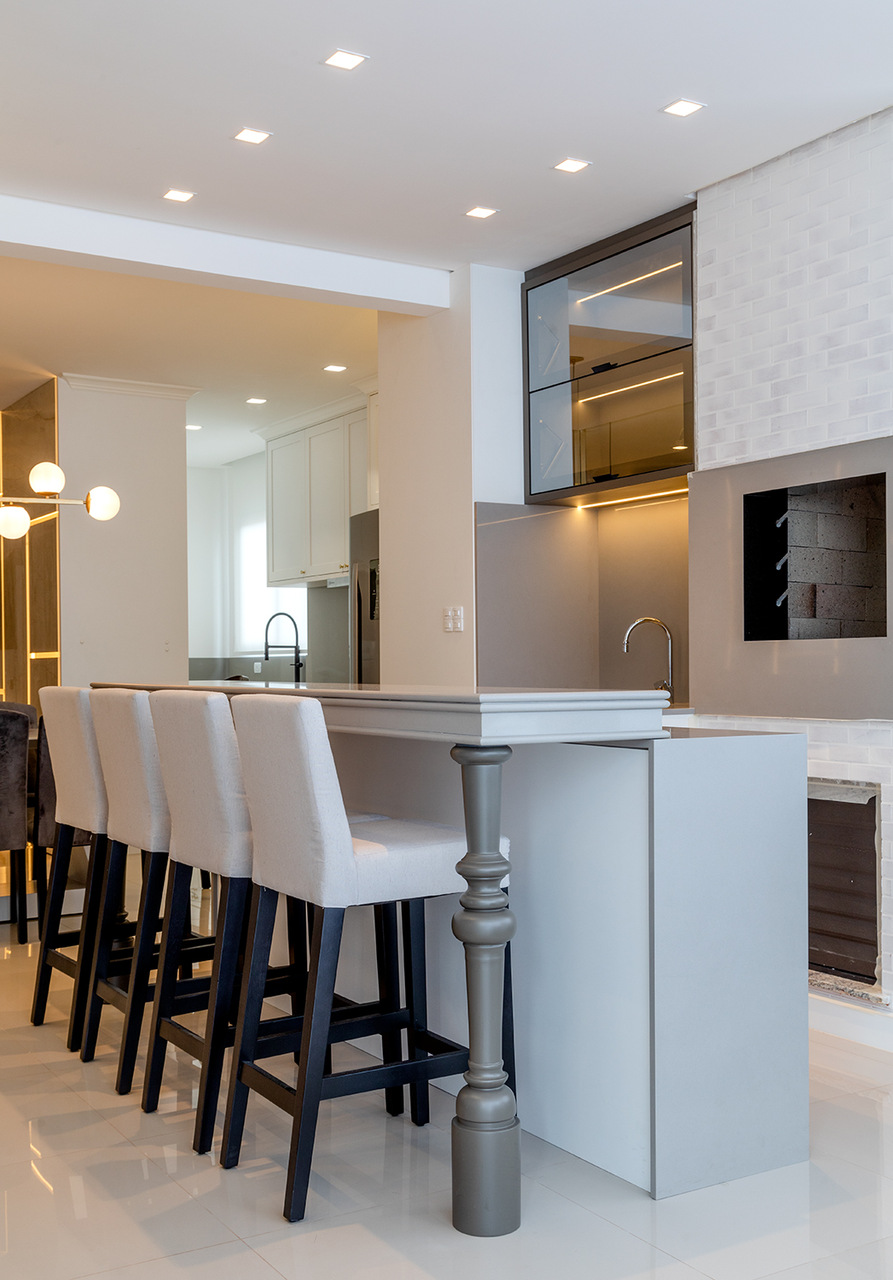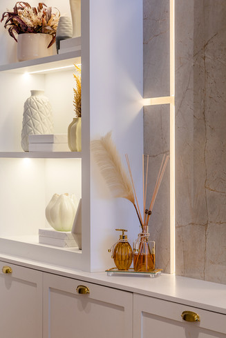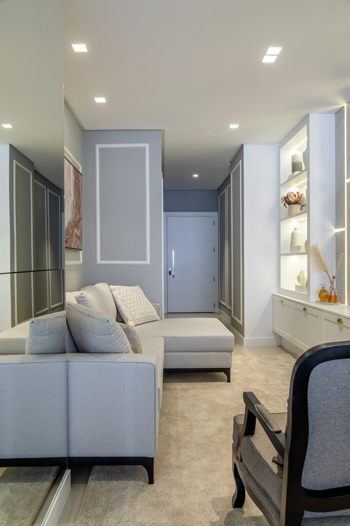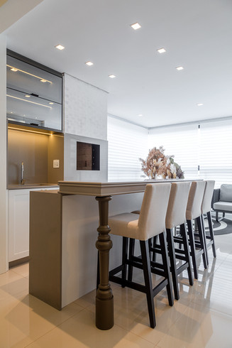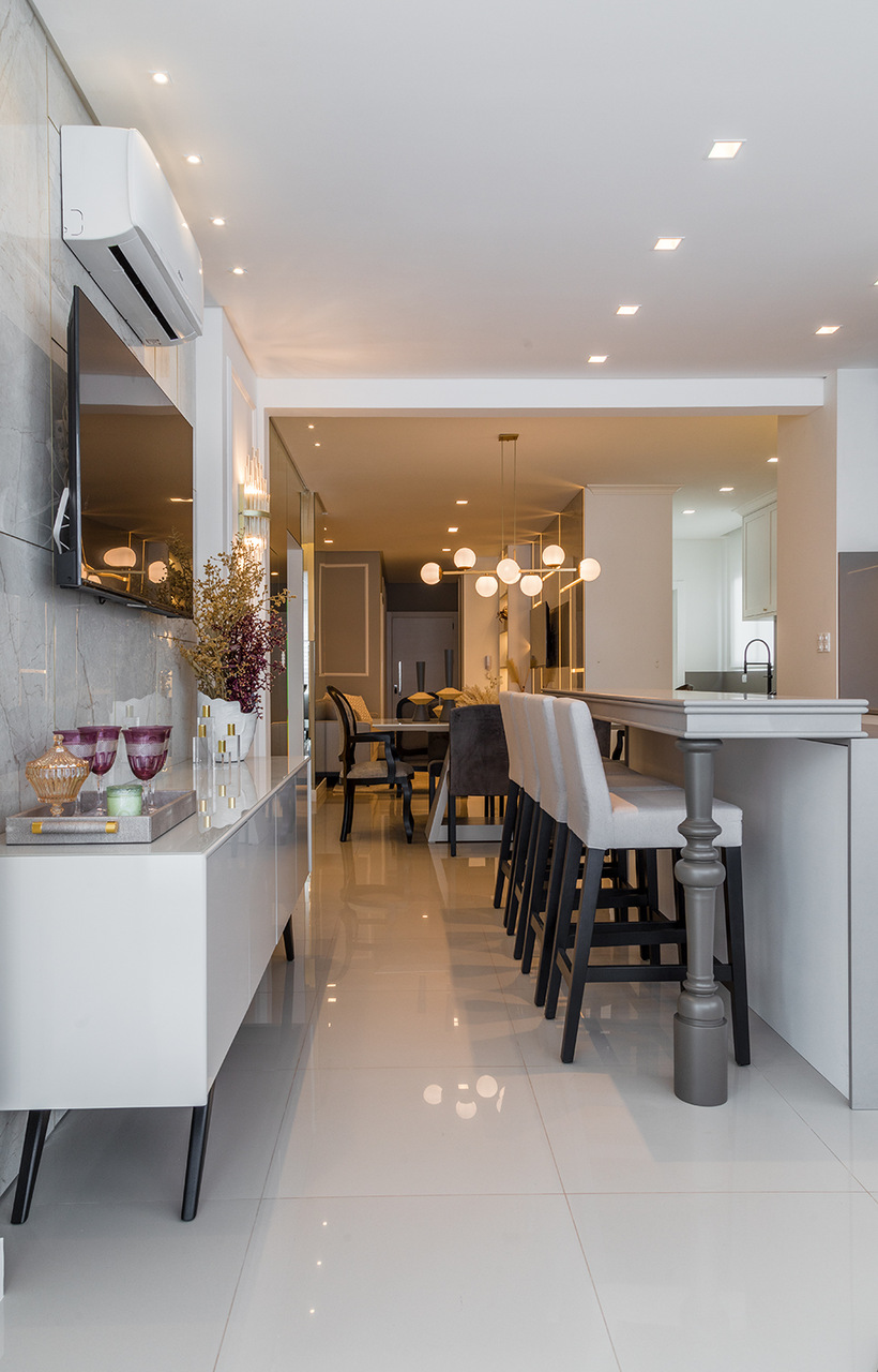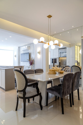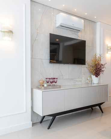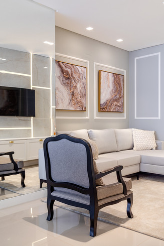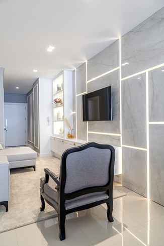 Apartamento localizado no edifício Bosco Verticale, projeto esse assinado pelo escritório. A residência segue o estilo neoclássico como preferência do proprietário, porém, há o contraponto de outras vertentes para conferir autenticidade ao projeto. Destaque para a sala de estar que age como ambiente de entrada, onde tem-se os boiseries de um lado e o home trabalhado em assimetria utilizando-se de porcelanatos e lighting design.