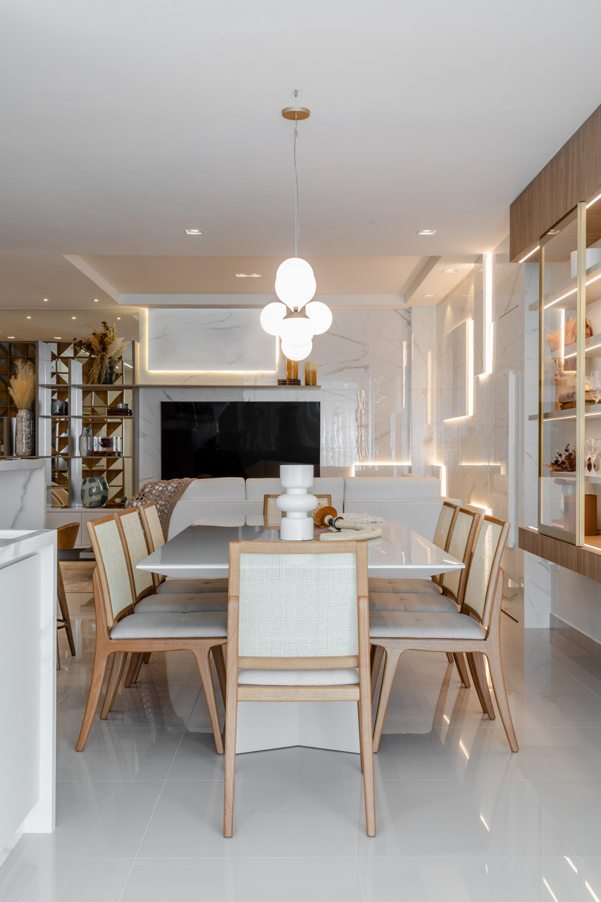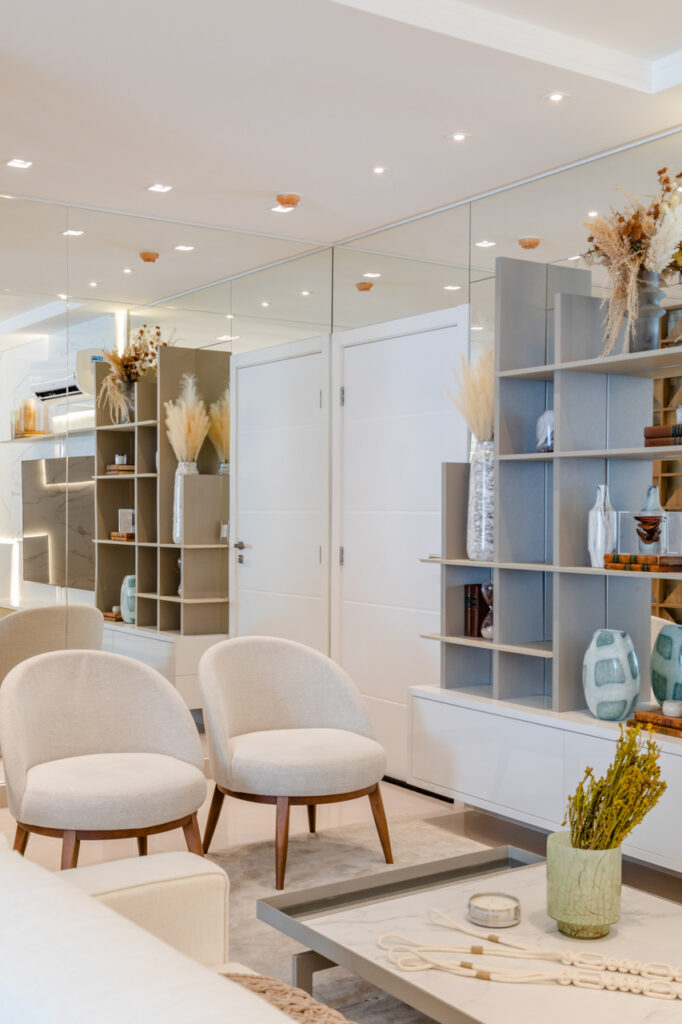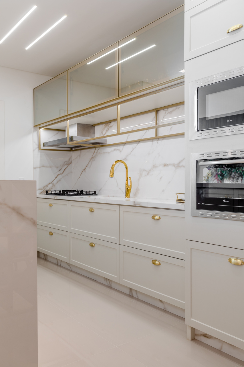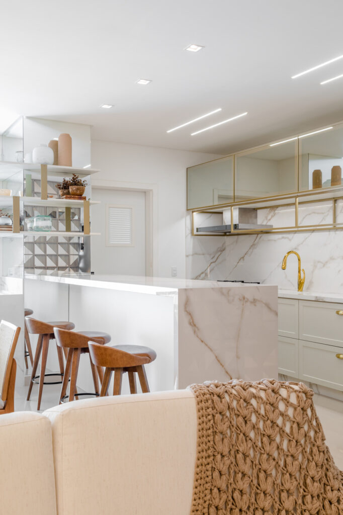 O apartamento usa como inspiração os elementos de clareza e sobriedade nos espaços. Para atingir esse objetivo, foram trabalhadas cores claras com detalhes em dourado, trazendo requinte para as diversas áreas da residência. Em contraposto à esses elementos neoclássicos que inspiraram majoritamente a residência, trouxemos variados elementos que aproximam o estar da praia e da natureza, como a palha e diversos tipos de paredes verdes e vegetações.