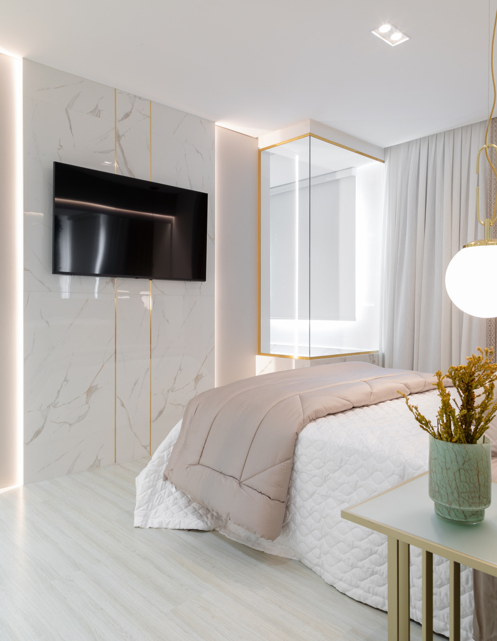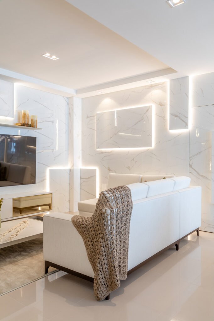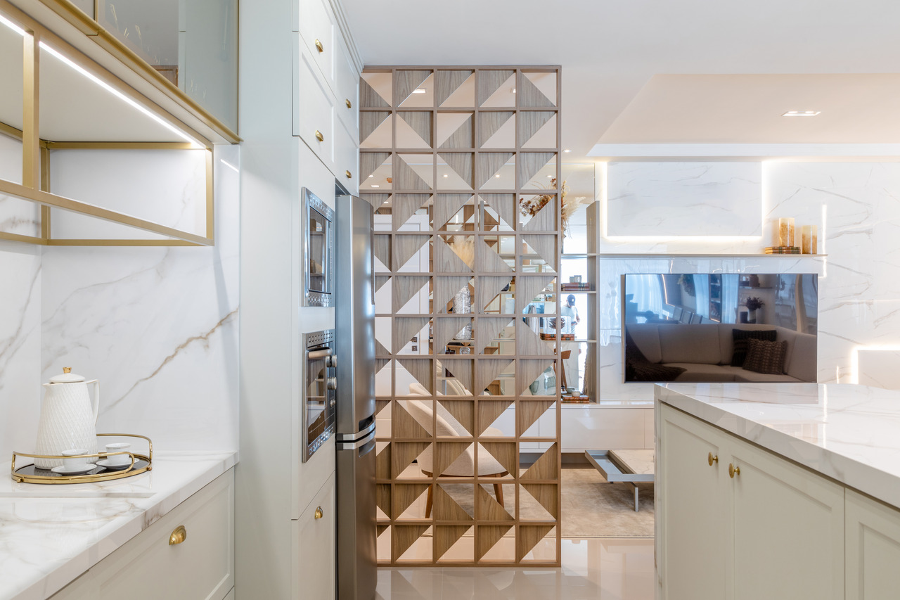 O apartamento usa como inspiração os elementos de clareza e sobriedade nos espaços. Para atingir esse objetivo, foram trabalhadas cores claras com detalhes em dourado, trazendo requinte para as diversas áreas da residência. Em contraposto à esses elementos neoclássicos que inspiraram majoritamente a residência, trouxemos variados elementos que aproximam o estar da praia e da natureza, como a palha e diversos tipos de paredes verdes e vegetações.