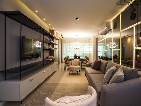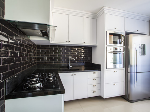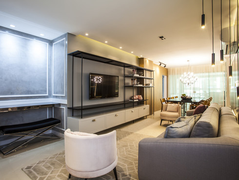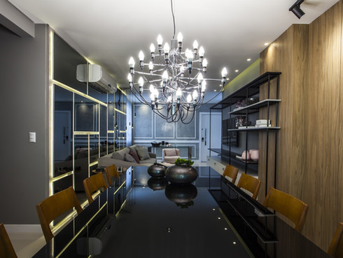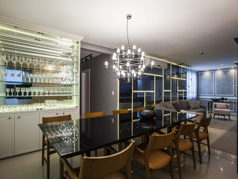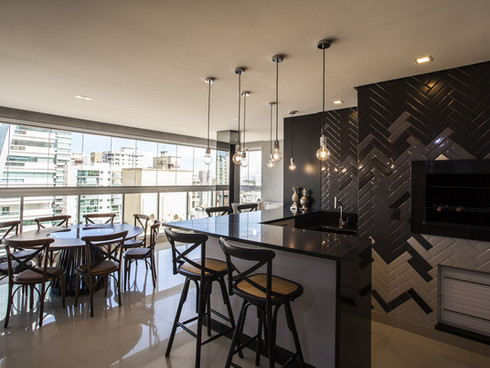 O apartamento traz consigo as cores de uma atmosfera urbana, o tons de cinza e o preto trazem essa sobriedade, bem como as superfícies polidas e o pendente contemporâneo da sala de jantar. A cozinha e área gourmet reforçam o conceito, com tijolinhos “metrô” monocromáticos.