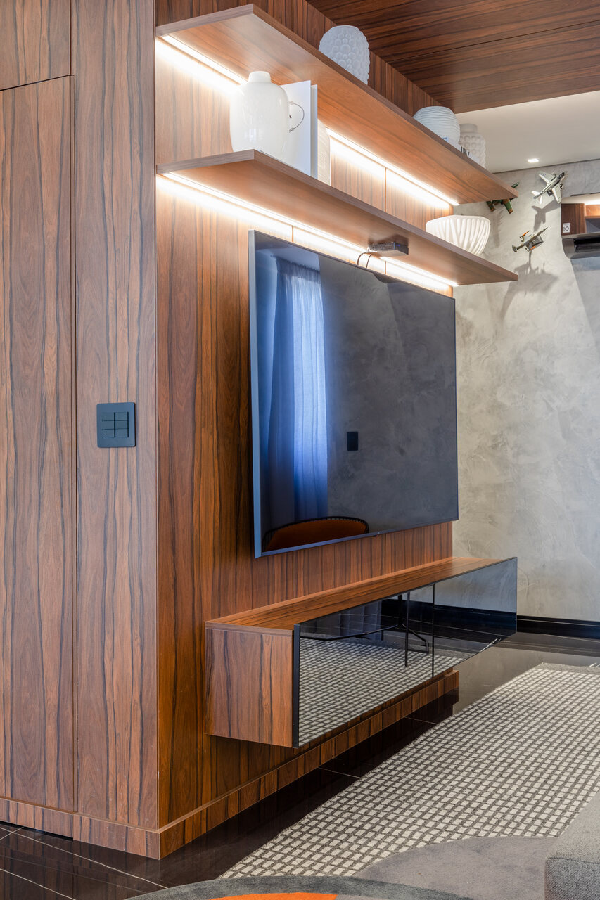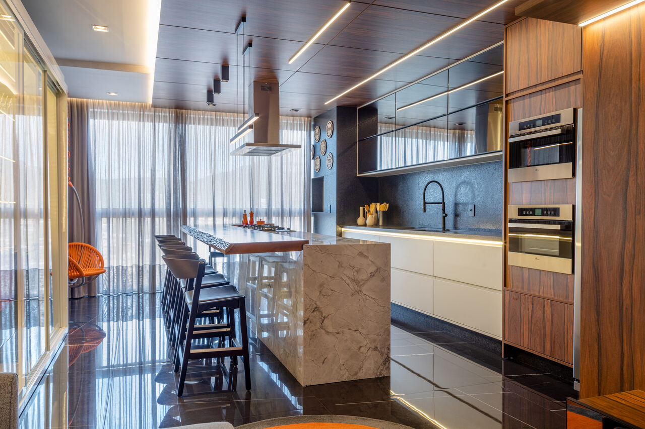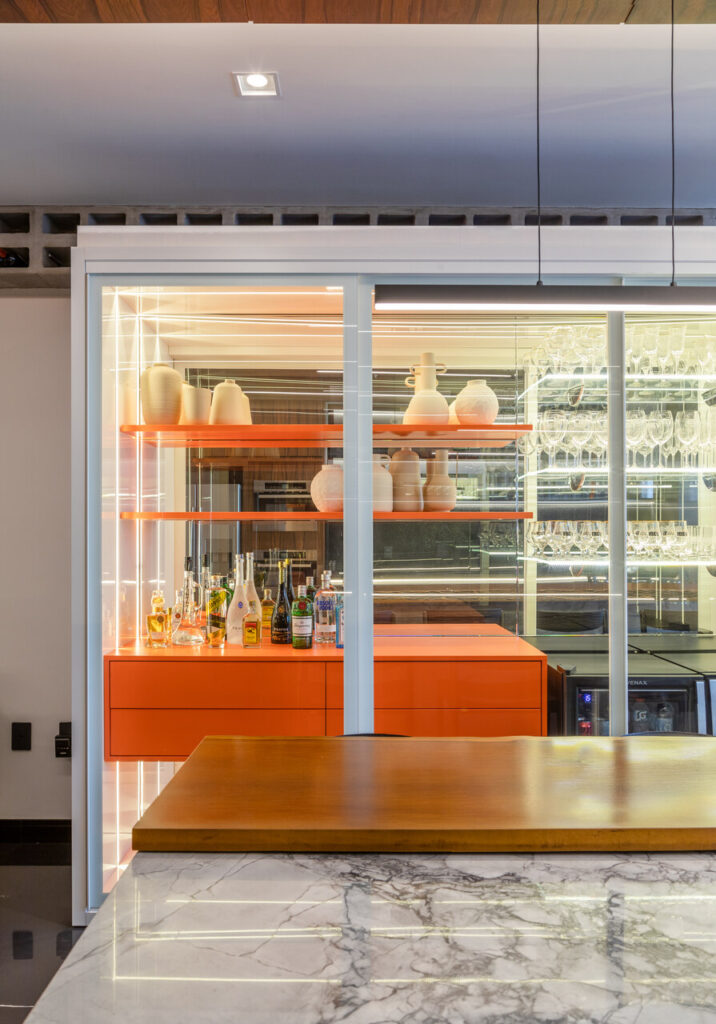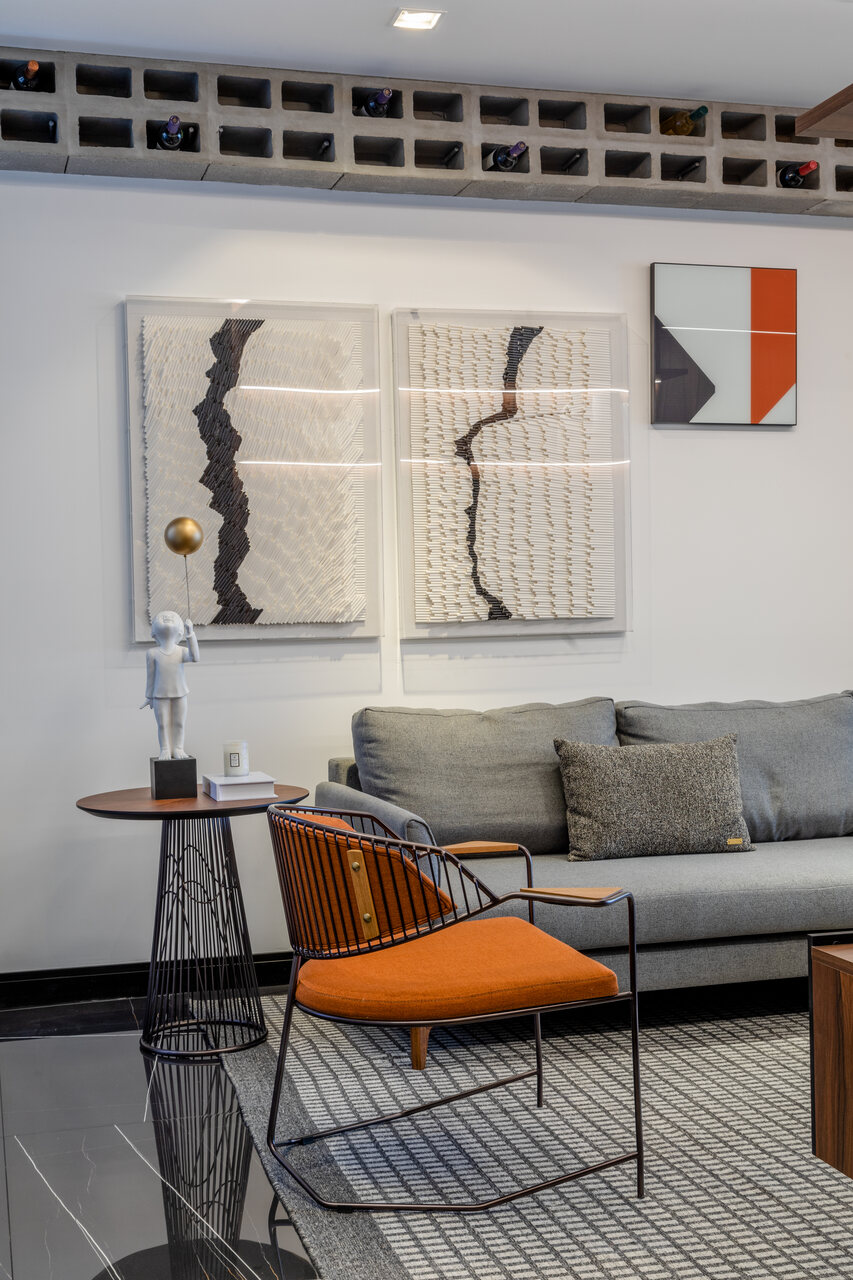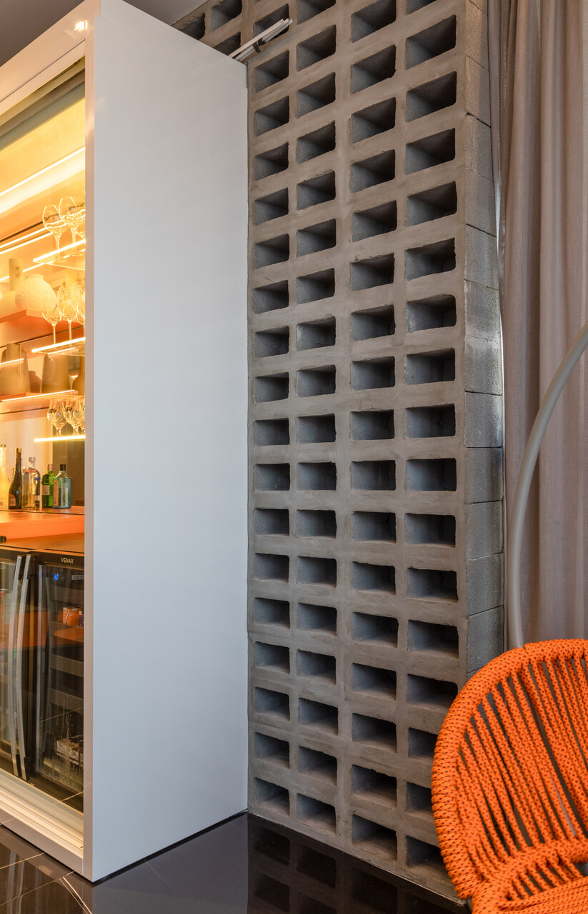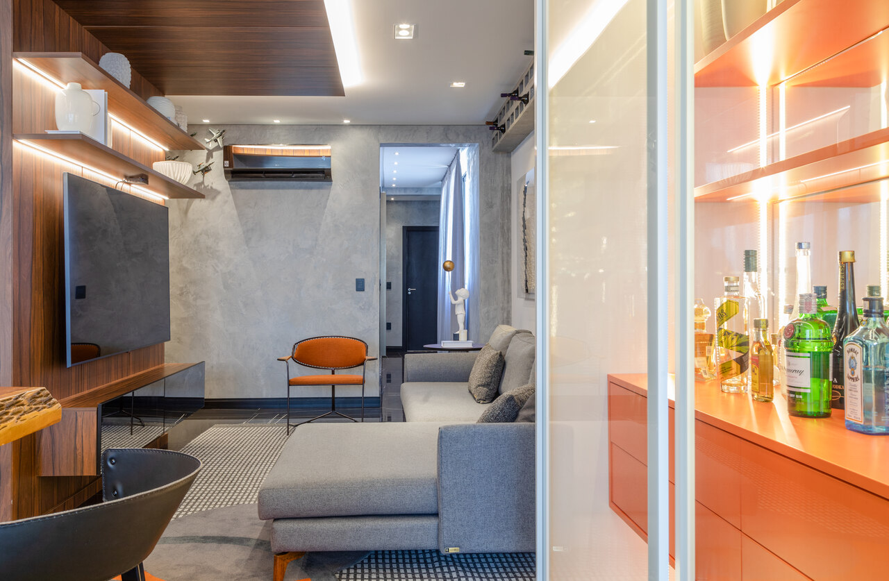 Com uma proposta contemporânea e despojada com uma paleta sóbria foi a premissa deste apartamento, com o living todo integrado o toque de ousadia ficou no uso da cor laranja em detalhes da marcenaria planejada e no mobiliário que contrapõem com o uso da madeira pau ferro e porcelanato nero marquina, um detalhe a parte é adega construída em tijolos de concreto onde boa parte da estrutura fica em balanço, avançando sob a sala.
