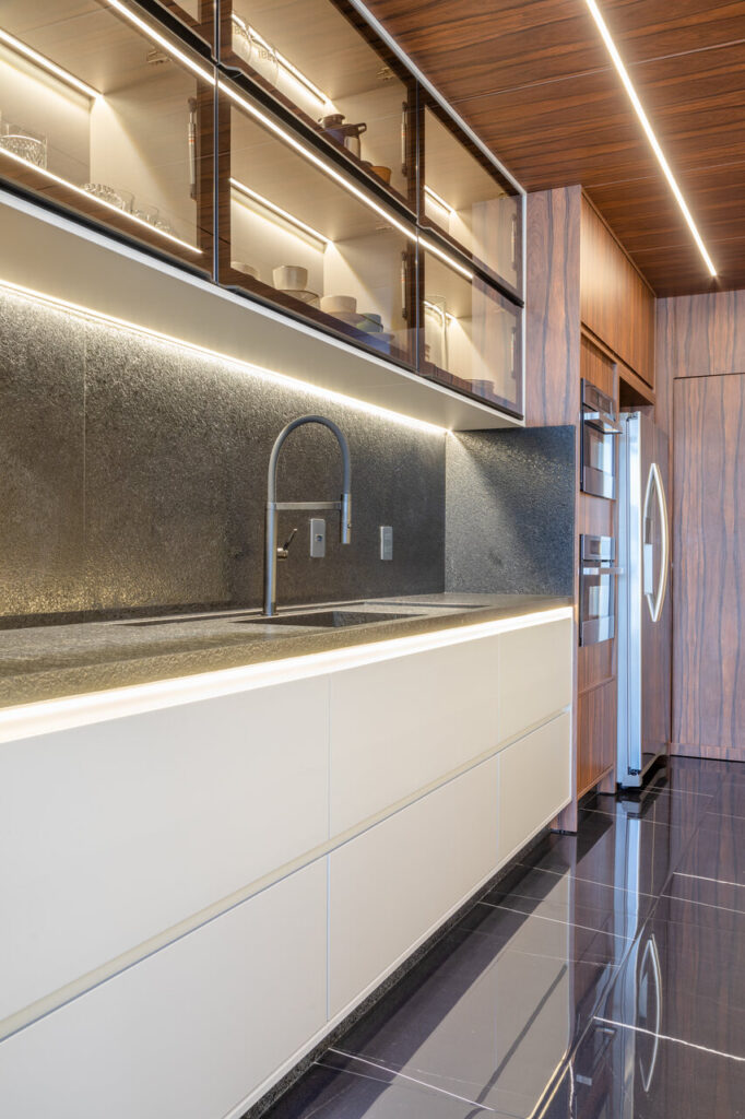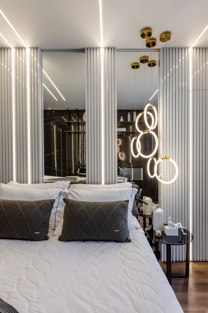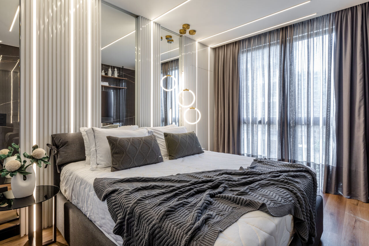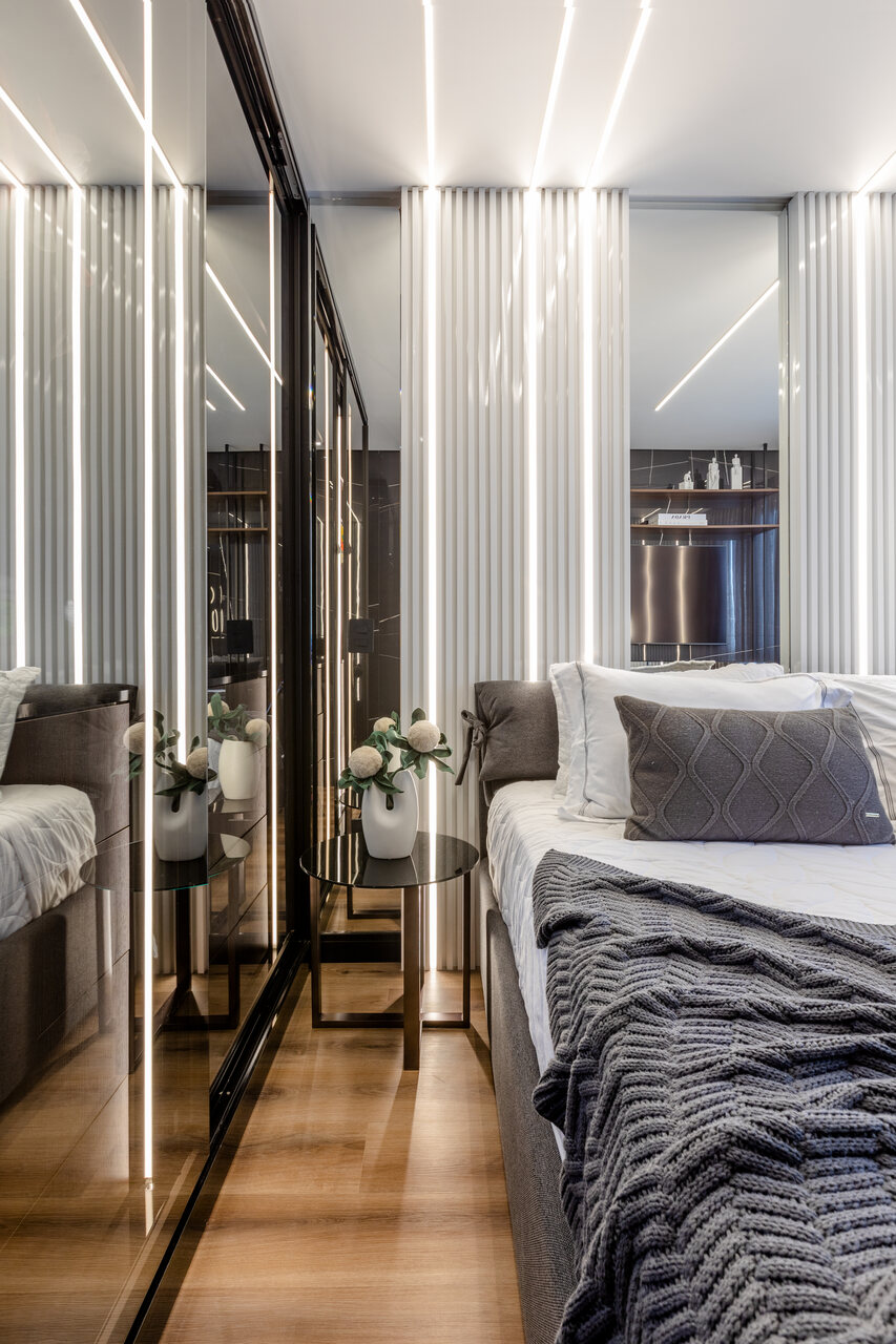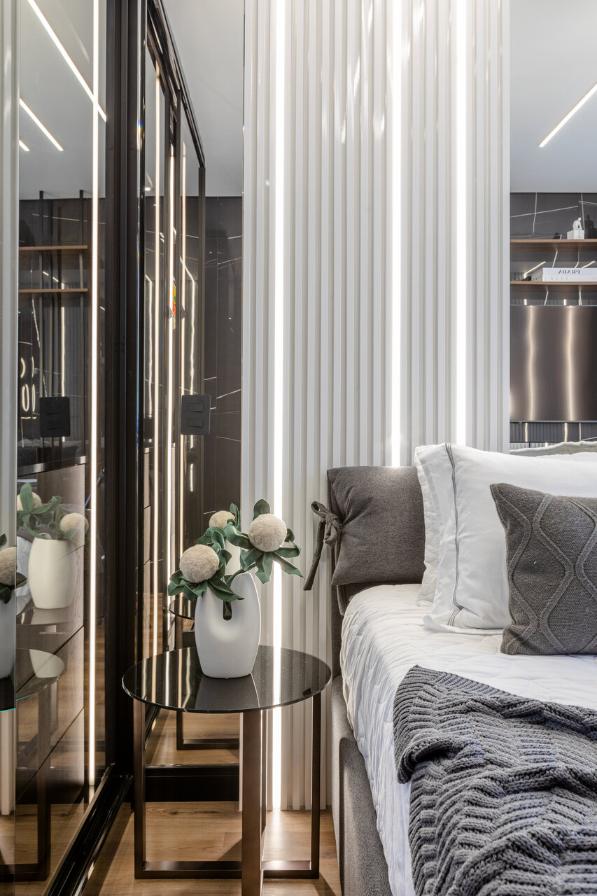 Com uma proposta contemporânea e despojada com uma paleta sóbria foi a premissa deste apartamento, com o living todo integrado o toque de ousadia ficou no uso da cor laranja em detalhes da marcenaria planejada e no mobiliário que contrapõem com o uso da madeira pau ferro e porcelanato nero marquina, um detalhe a parte é adega construída em tijolos de concreto onde boa parte da estrutura fica em balanço, avançando sob a sala.
