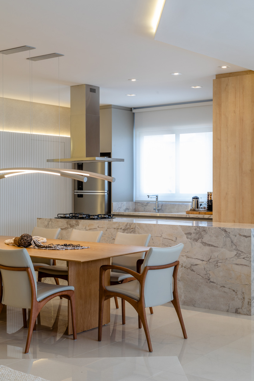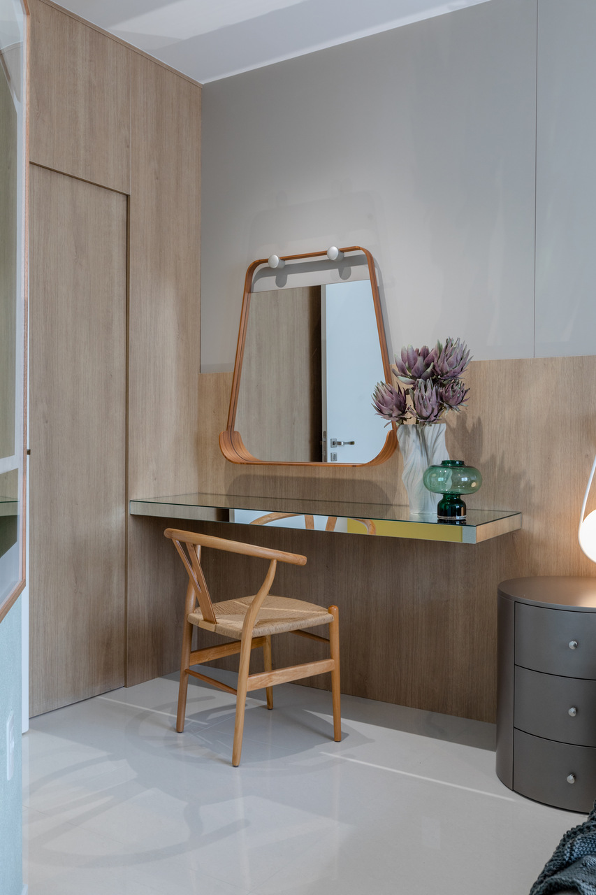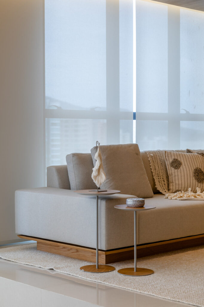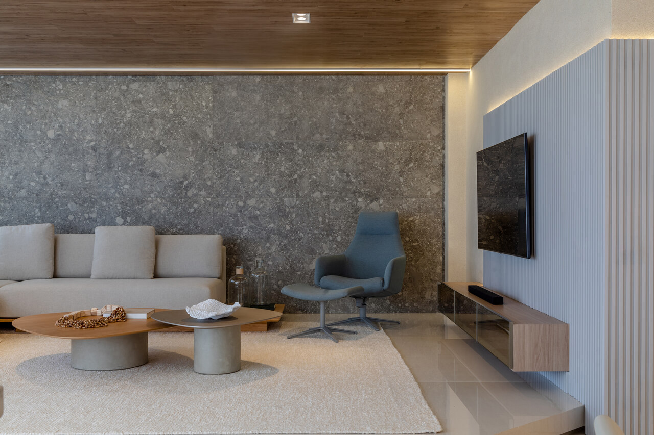 O apartamento localizado no Ed. Maison Garden teve como premissa a forte conexão entre o empreendimento e a vista do Rio Perequê e da praia. A partir disso, nota-se a presença de elementos litorâneos que remetem ao briefing proposto. A paleta de cores, a materialidade e os elementos dispostos de forma orgânica e fluída relacionam-se a percepção de um lugar livre e leve para se morar, assim como a sensação de estar em contato com a brisa do mar.