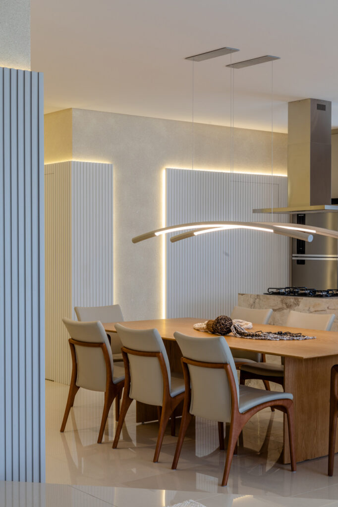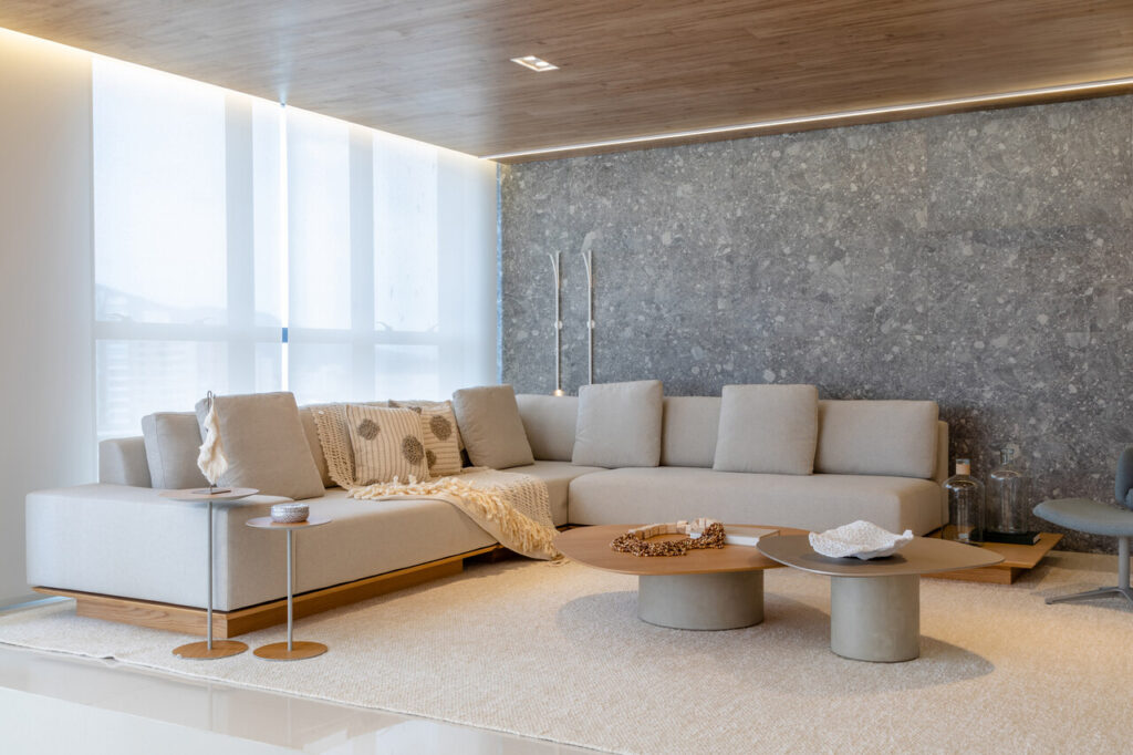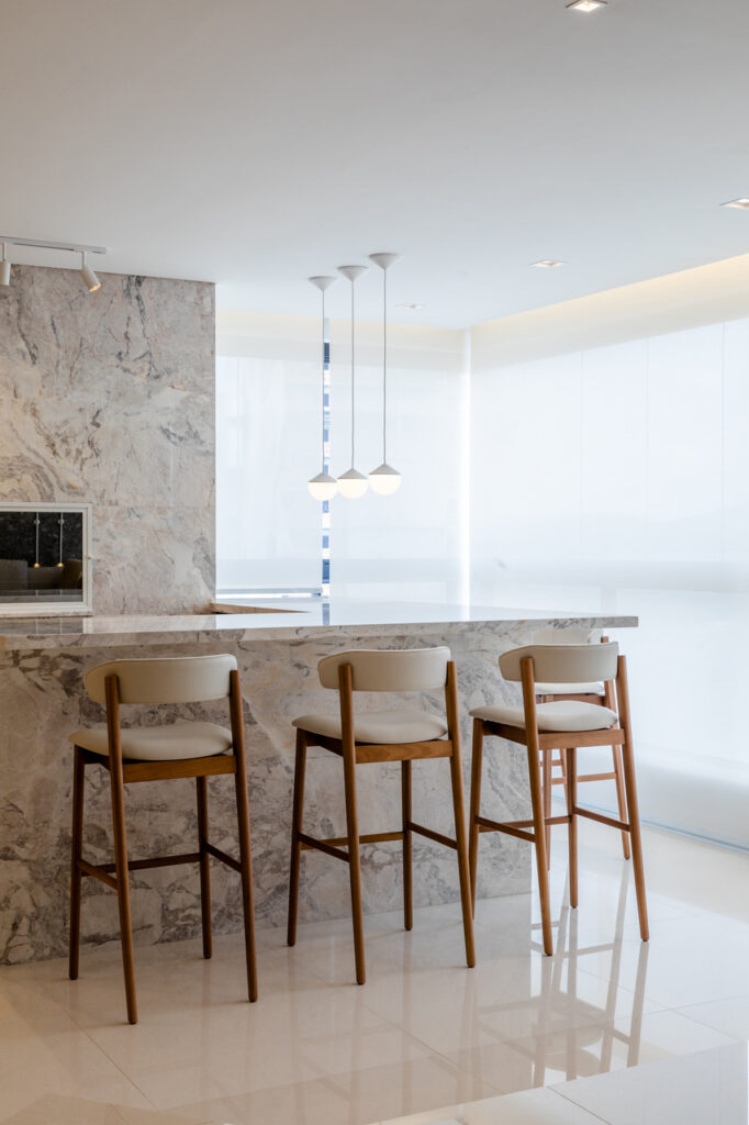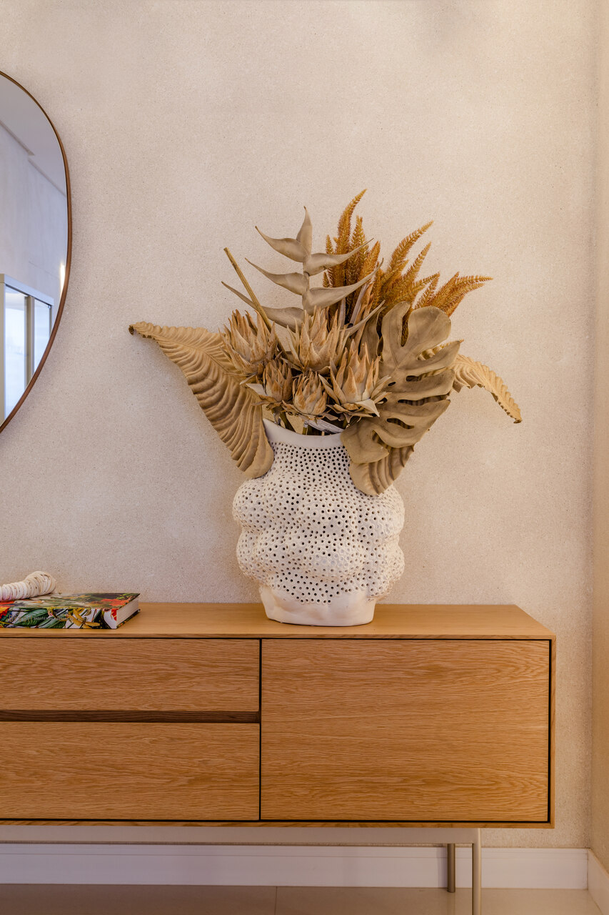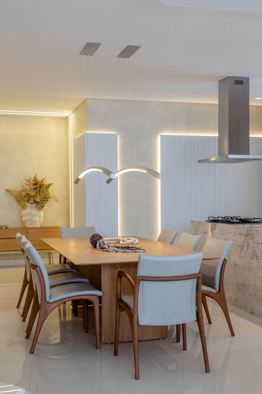 O apartamento localizado no Ed. Maison Garden teve como premissa a forte conexão entre o empreendimento e a vista do Rio Perequê e da praia. A partir disso, nota-se a presença de elementos litorâneos que remetem ao briefing proposto. A paleta de cores, a materialidade e os elementos dispostos de forma orgânica e fluída relacionam-se a percepção de um lugar livre e leve para se morar, assim como a sensação de estar em contato com a brisa do mar.