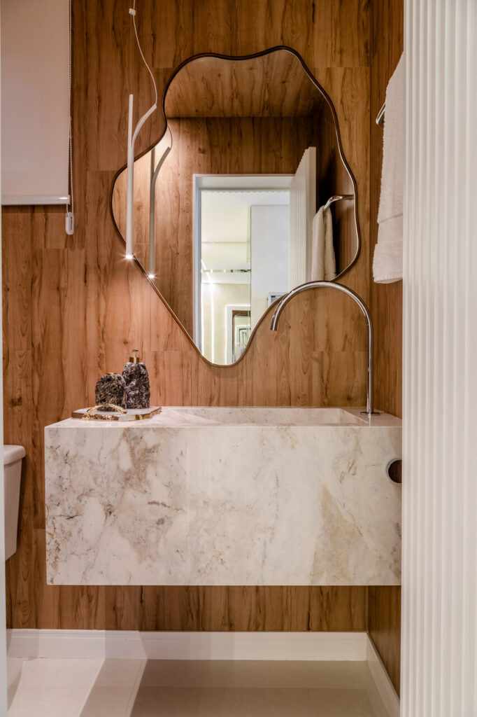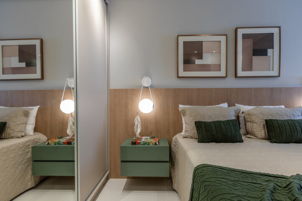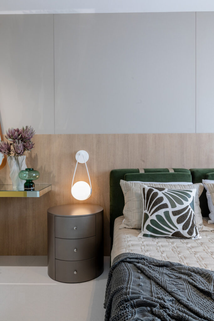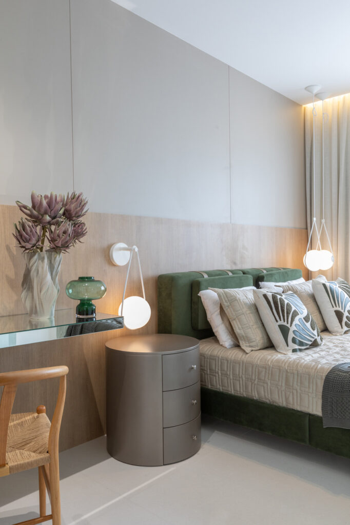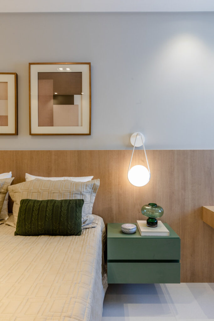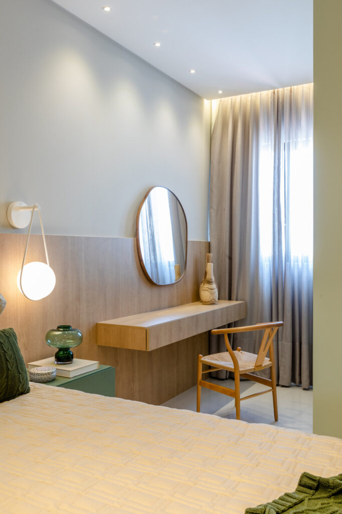 O apartamento localizado no Ed. Maison Garden teve como premissa a forte conexão entre o empreendimento e a vista do Rio Perequê e da praia. A partir disso, nota-se a presença de elementos litorâneos que remetem ao briefing proposto. A paleta de cores, a materialidade e os elementos dispostos de forma orgânica e fluída relacionam-se a percepção de um lugar livre e leve para se morar, assim como a sensação de estar em contato com a brisa do mar.