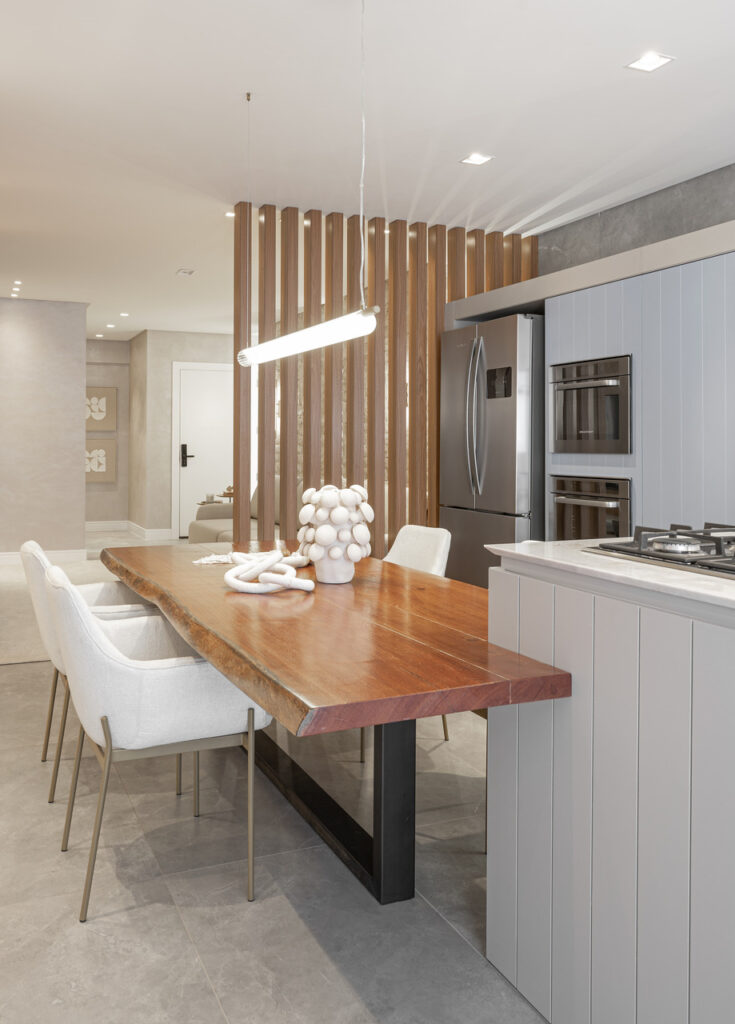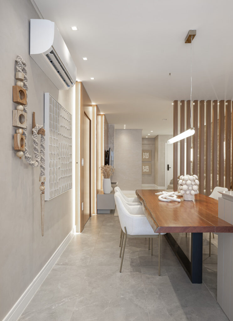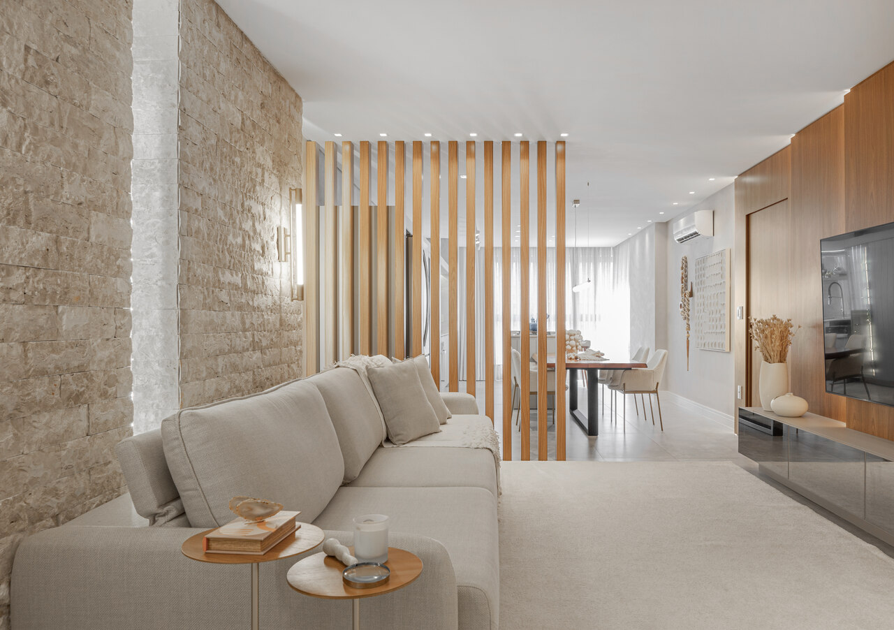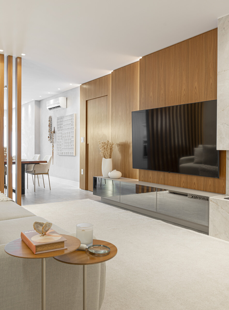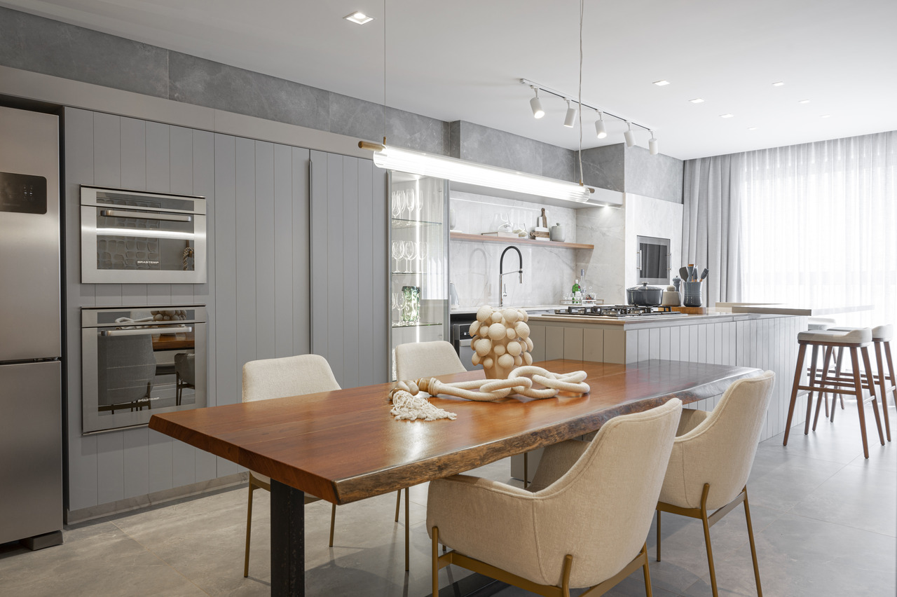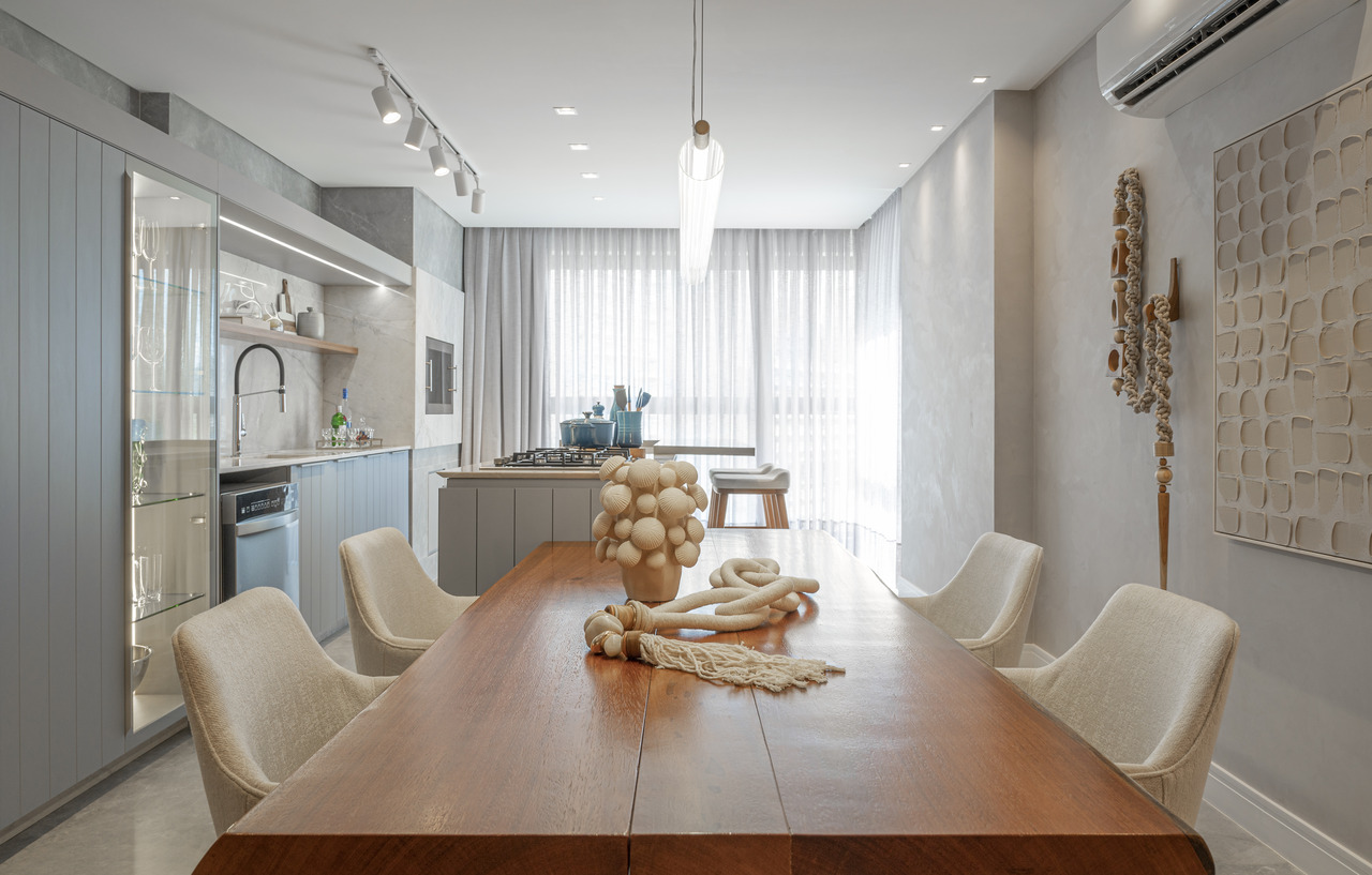 Um projeto que se estende de forma fluida por todos os ambientes, mantendo uma linguagem coesa e sofisticada. A base neutra, aliada ao uso marcante da madeira e da pedra natural, cria uma identidade atemporal que percorre cada espaço. Elementos como o ripado, presentes na setorização, reforçam a integração sem abrir mão da privacidade, enquanto o mobiliário de linhas limpas e texturas suaves garante conforto e elegância. A iluminação valoriza os materiais e conduz o olhar, evidenciando a continuidade do projeto e a harmonia entre os ambientes, resultando em uma atmosfera acolhedora e contemporânea.