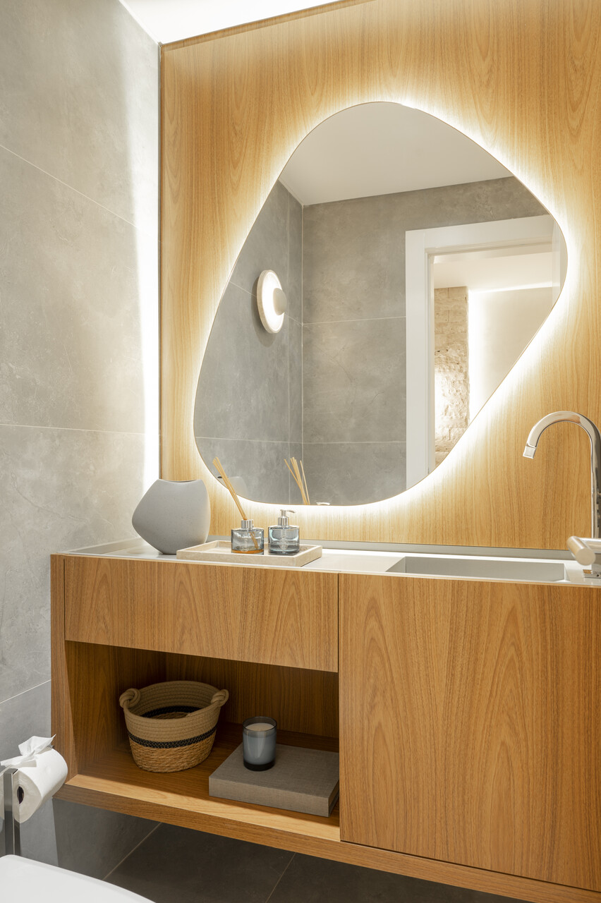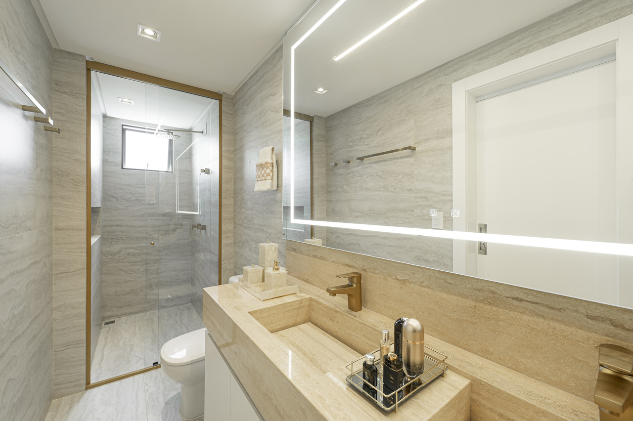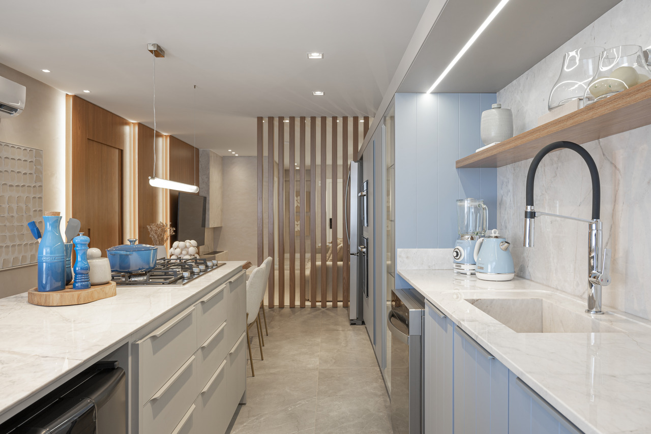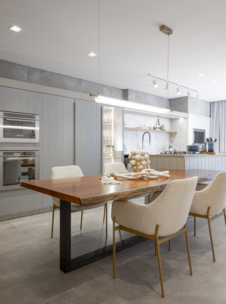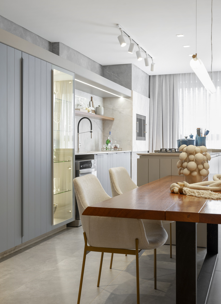 Um projeto que se estende de forma fluida por todos os ambientes, mantendo uma linguagem coesa e sofisticada. A base neutra, aliada ao uso marcante da madeira e da pedra natural, cria uma identidade atemporal que percorre cada espaço. Elementos como o ripado, presentes na setorização, reforçam a integração sem abrir mão da privacidade, enquanto o mobiliário de linhas limpas e texturas suaves garante conforto e elegância. A iluminação valoriza os materiais e conduz o olhar, evidenciando a continuidade do projeto e a harmonia entre os ambientes, resultando em uma atmosfera acolhedora e contemporânea.