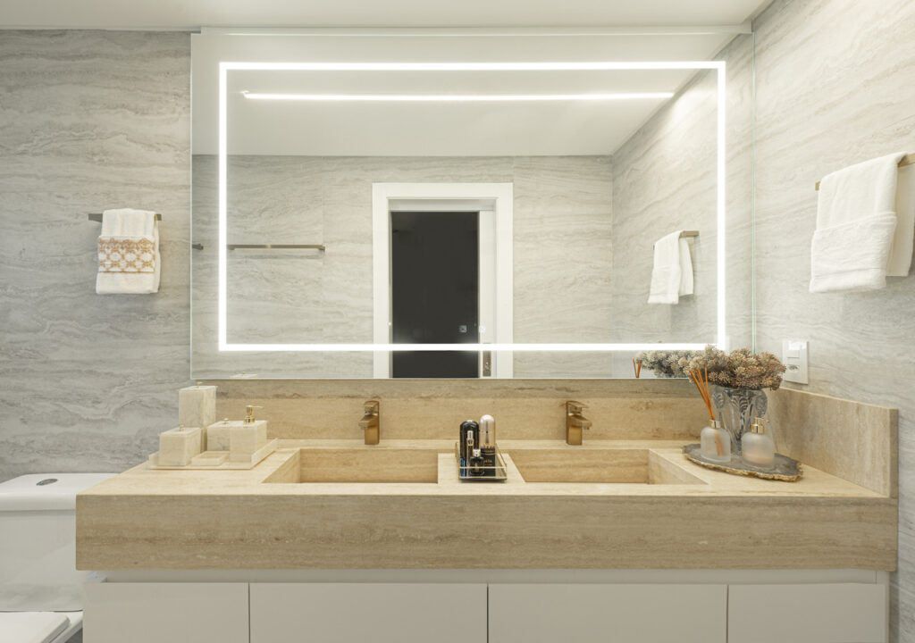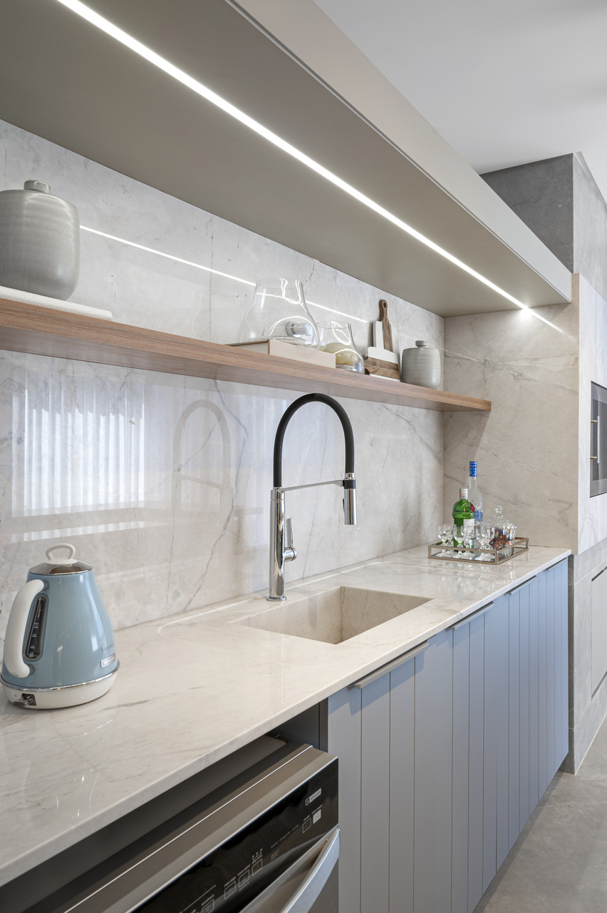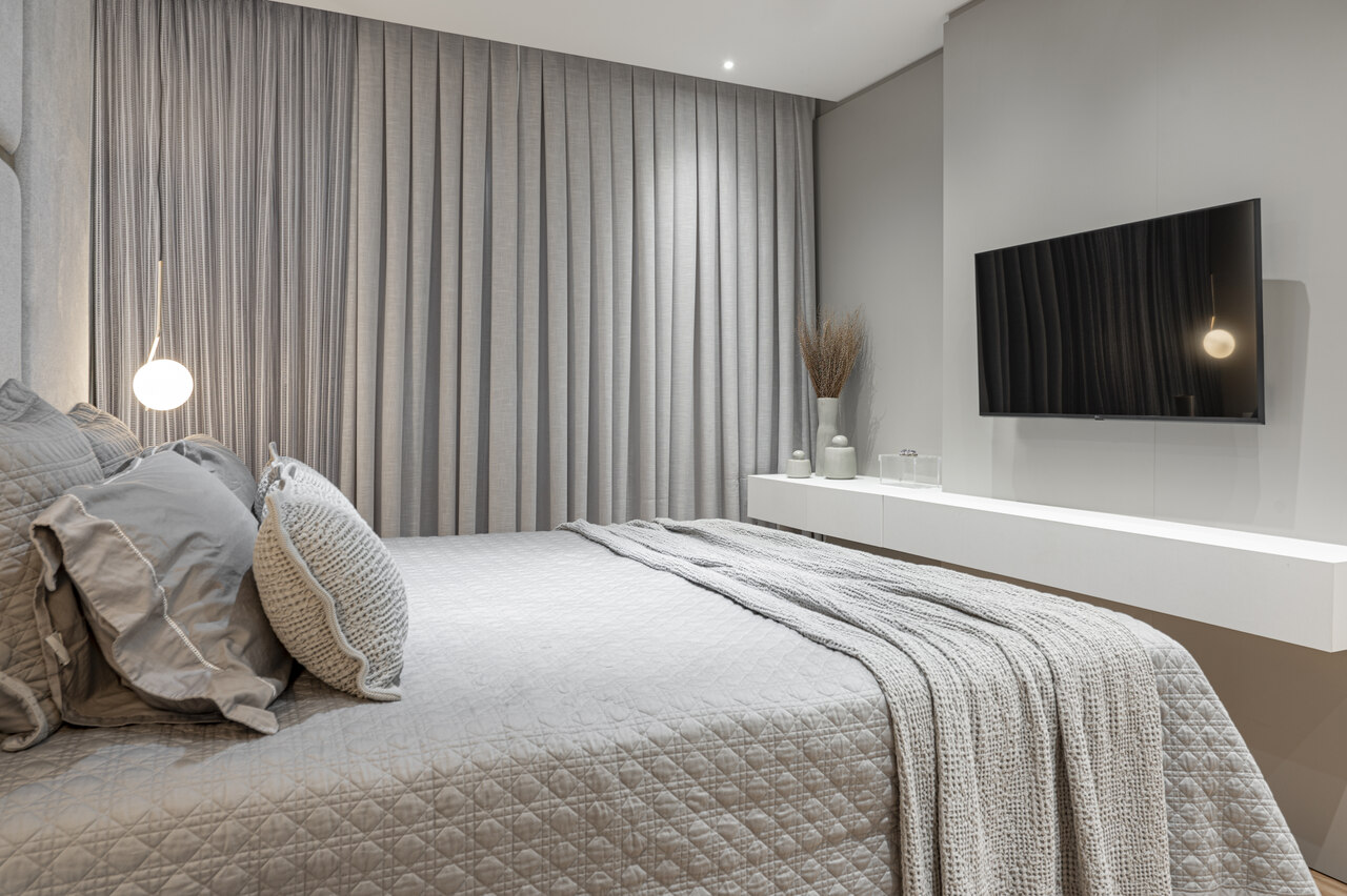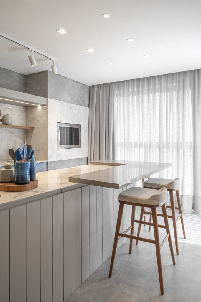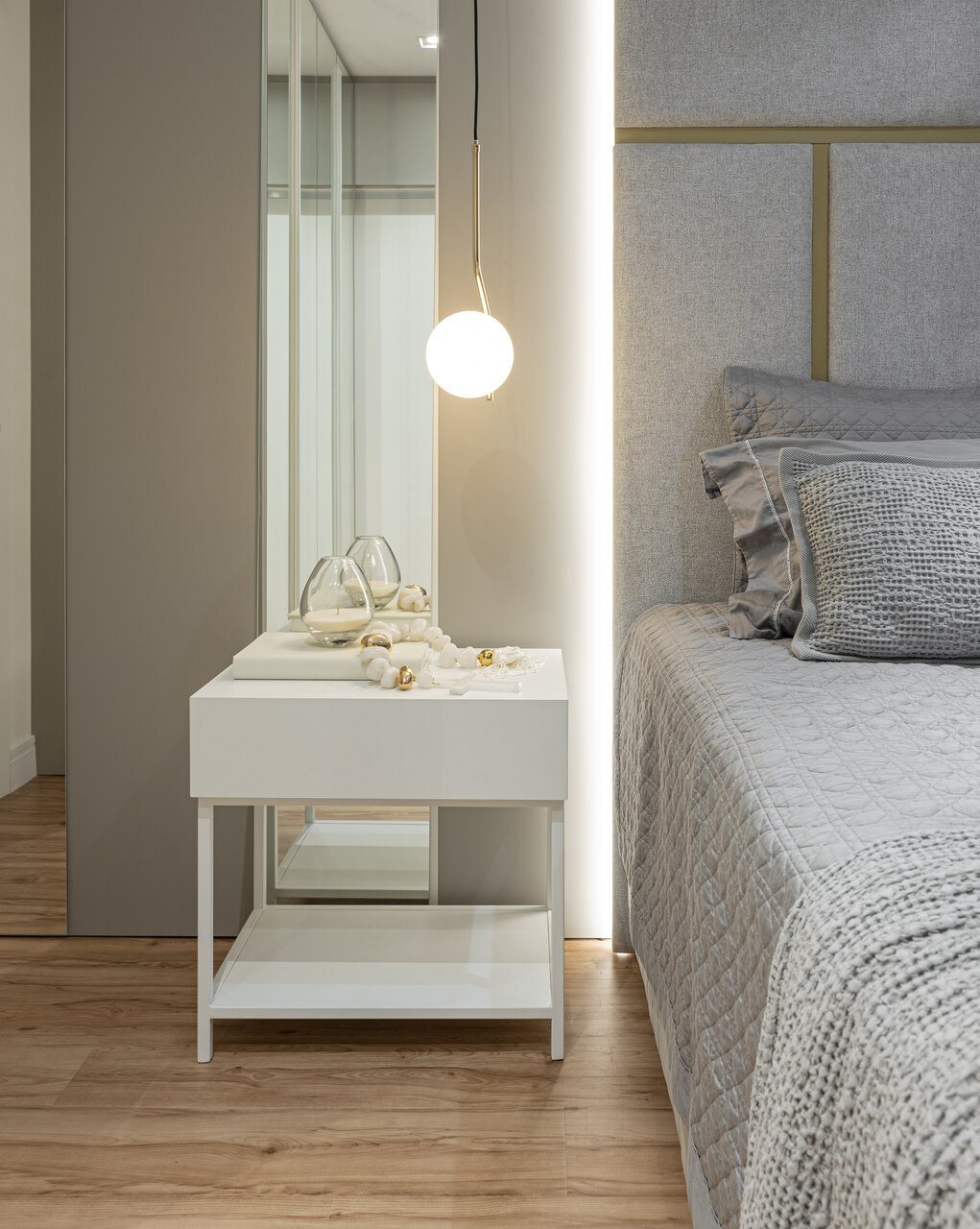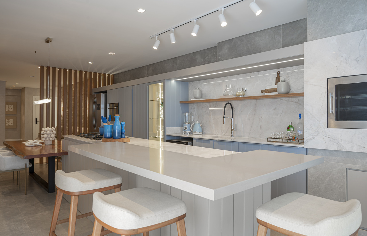 Um projeto que se estende de forma fluida por todos os ambientes, mantendo uma linguagem coesa e sofisticada. A base neutra, aliada ao uso marcante da madeira e da pedra natural, cria uma identidade atemporal que percorre cada espaço. Elementos como o ripado, presentes na setorização, reforçam a integração sem abrir mão da privacidade, enquanto o mobiliário de linhas limpas e texturas suaves garante conforto e elegância. A iluminação valoriza os materiais e conduz o olhar, evidenciando a continuidade do projeto e a harmonia entre os ambientes, resultando em uma atmosfera acolhedora e contemporânea.