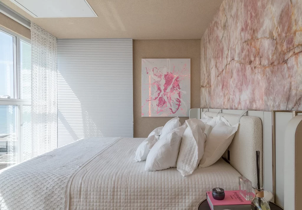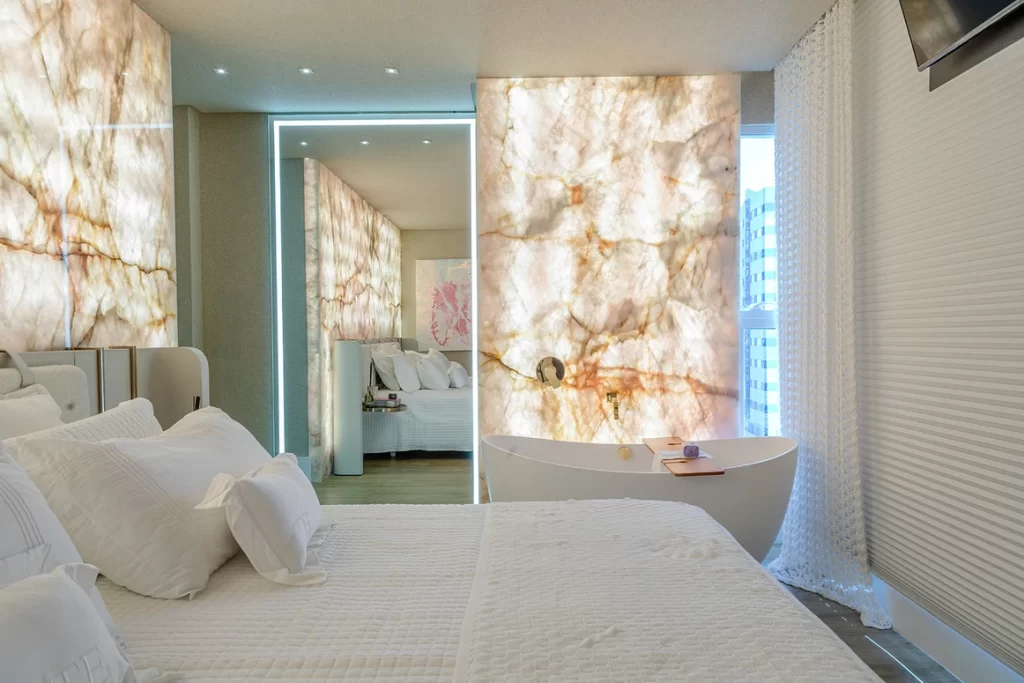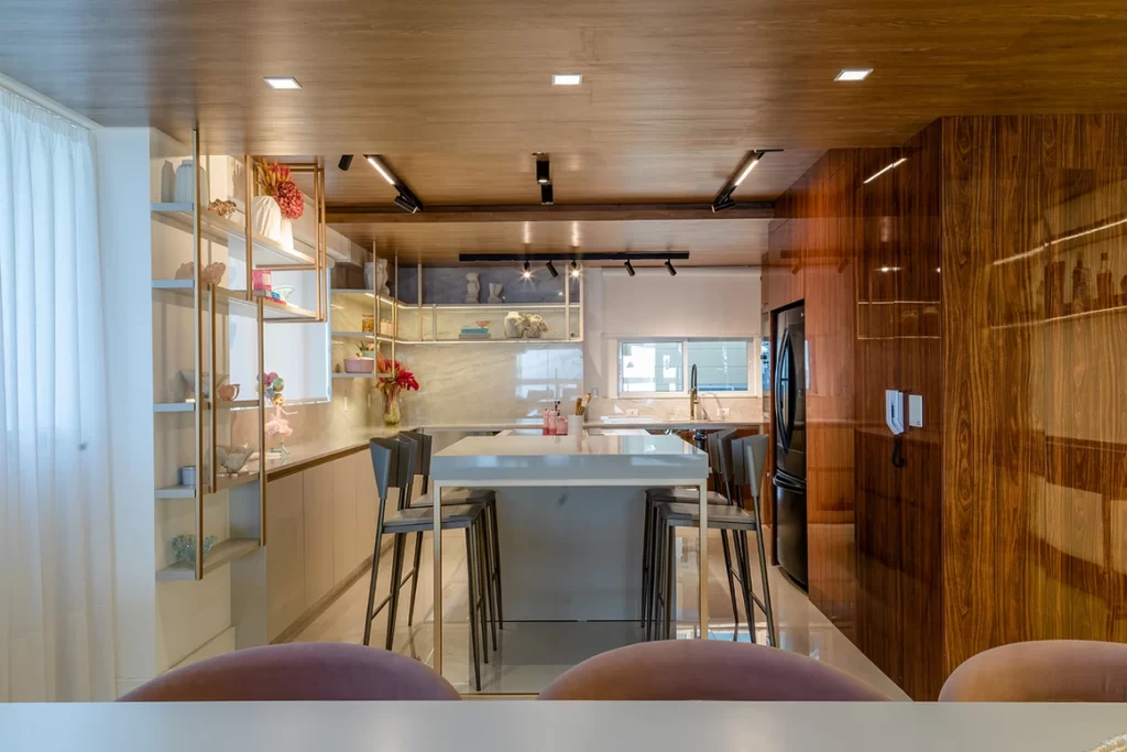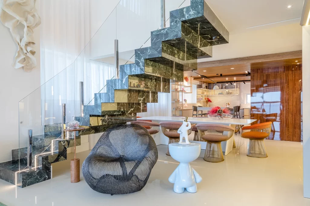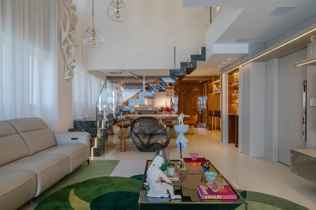 Um apartamento contemporâneo e ousado, estes foram os princípios para a elaboração deste projeto, com uma base neutra da marcenaria que se contrapõem a madeira pau ferro em alto brilho. Esses materiais conectam-se pelos veios do mármore da bancada branco paraná, a ousadia entra nos detalhes e móveis soltos, explorando cores e formas diferenciadas. Outro destaque deste duplex é a escada revestida em porcelanato verde Alpissimi de grande formato, que separa o living e se torna um elemento único. Já na parte intima a suíte master tem a parede revestida em pedra ônix rosa iluminada, proporcionando toda beleza e exuberância desta pedra natural. O restante das paredes e teto foram revestidos com papel de parede liquido, o qual possui partículas de pedra, deixando o quarto mais aconchegante.