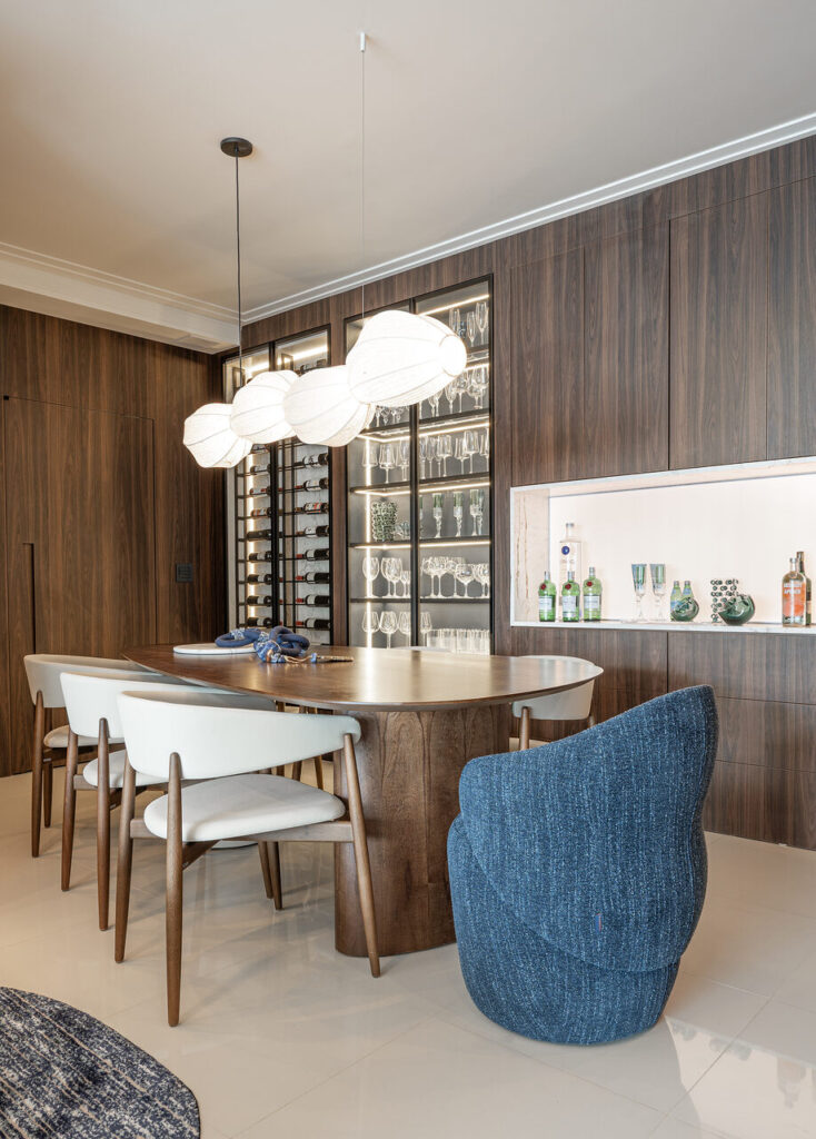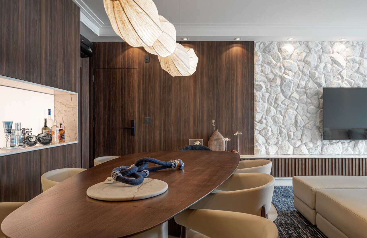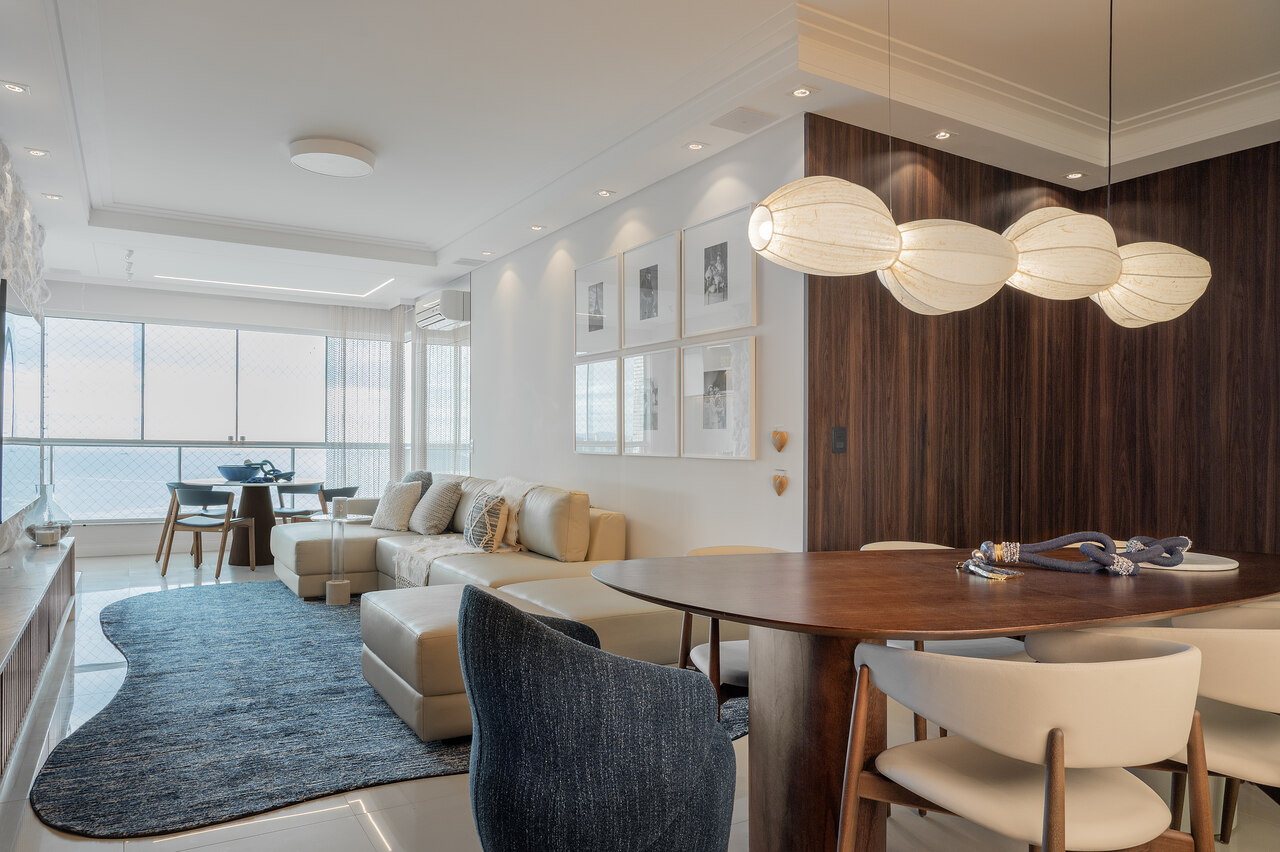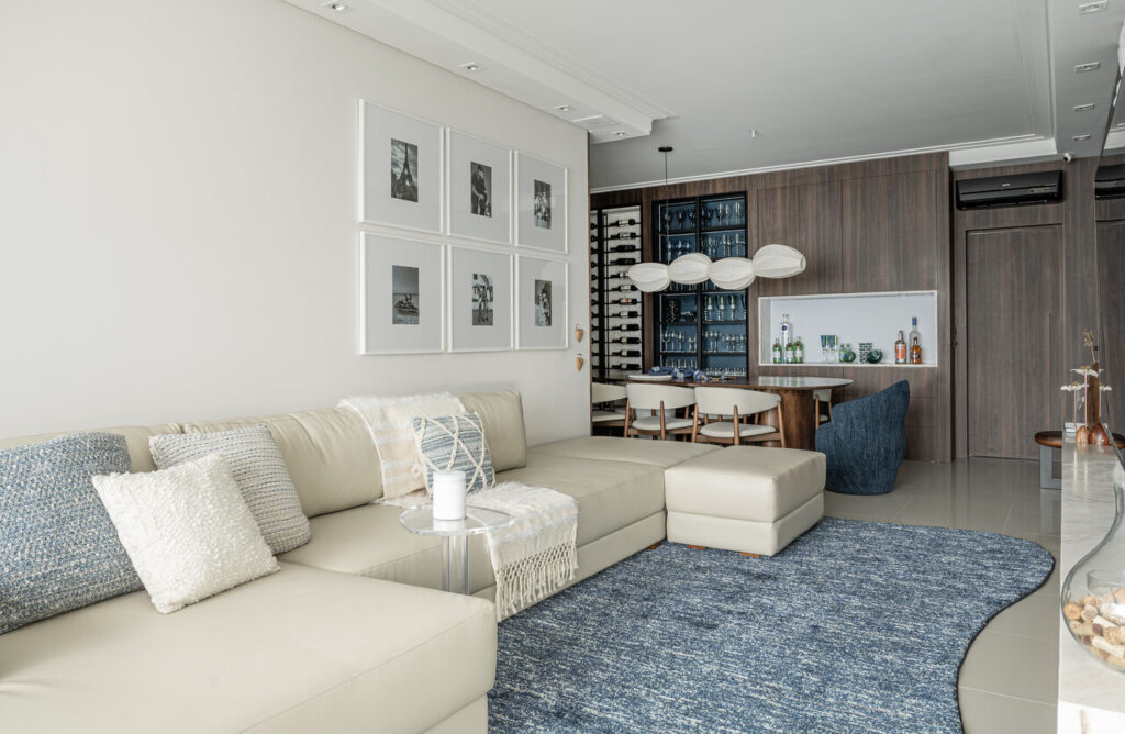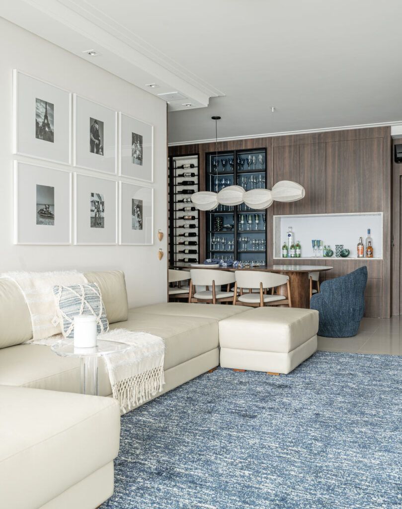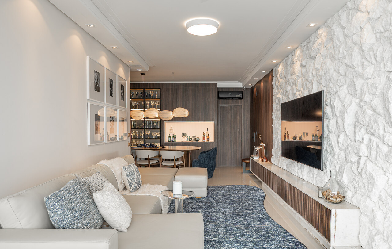 Um living elegante e acolhedor, onde a paleta neutra ganha profundidade com o contraste do azul e da madeira. O layout integrado valoriza a convivência, conectando estar, jantar e bar de forma fluida e sofisticada. O painel amadeirado com adega iluminada traz protagonismo e personalidade, enquanto o mobiliário de linhas orgânicas e texturas suaves reforça o conforto. A iluminação pendente sobre a mesa atua como elemento escultural, criando um ponto focal que equilibra modernidade e aconchego no ambiente.