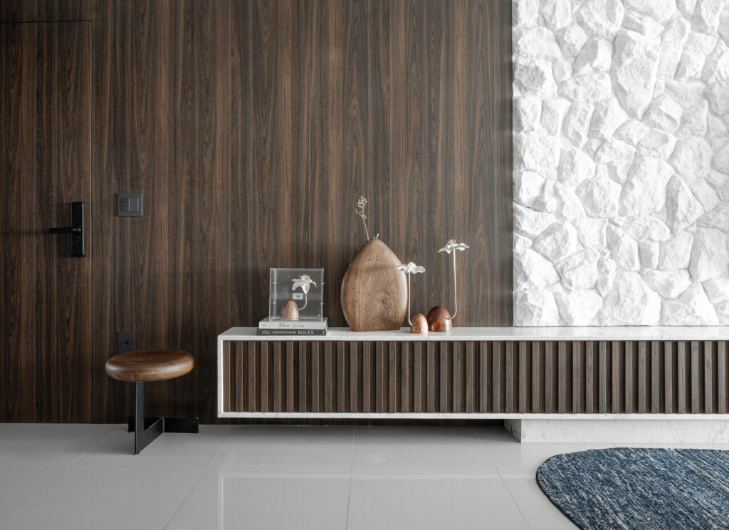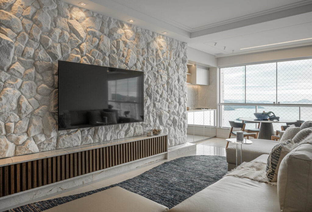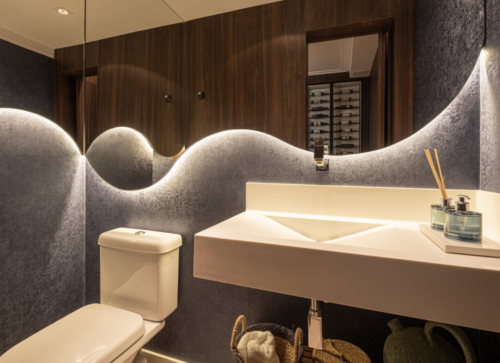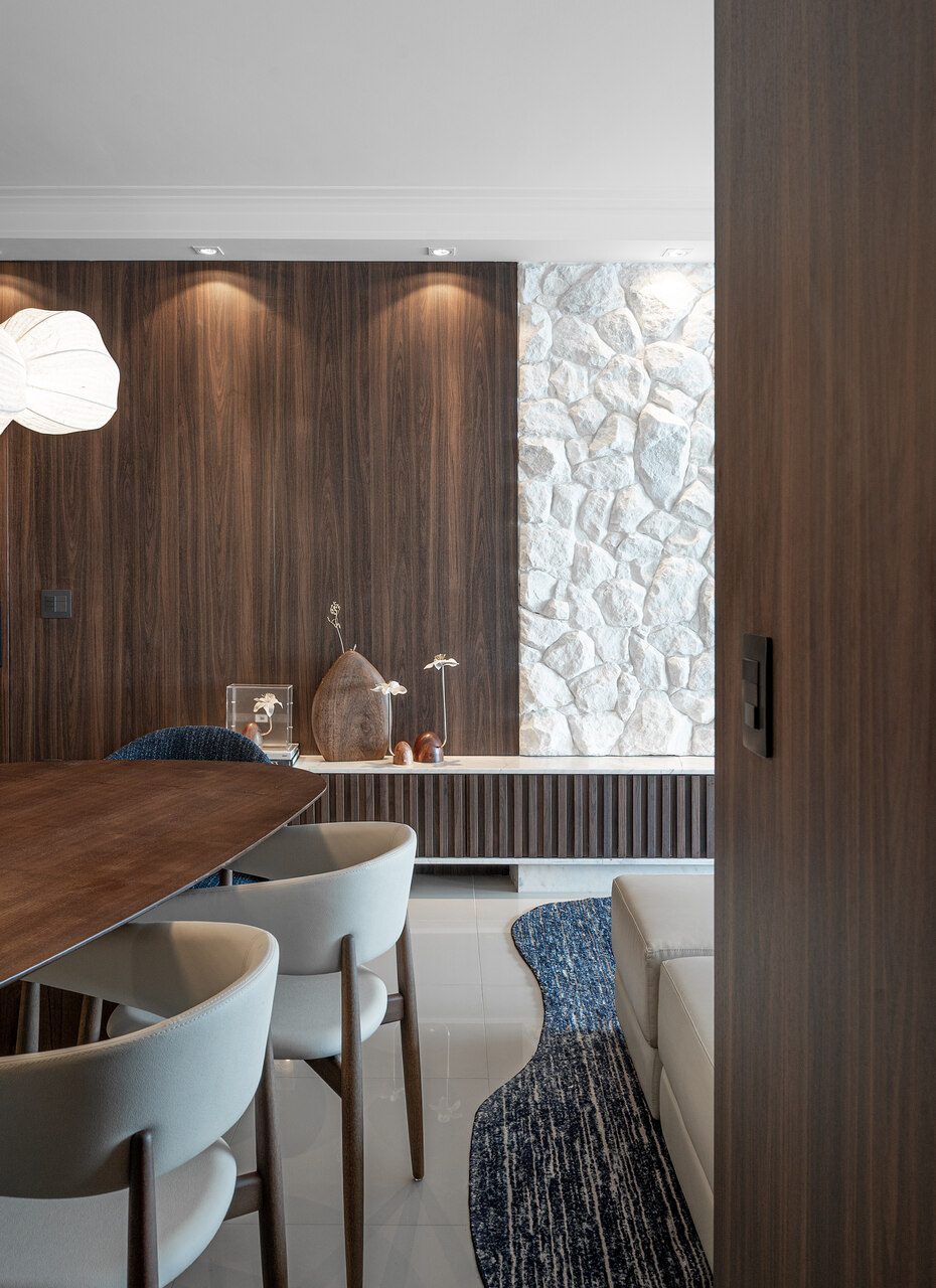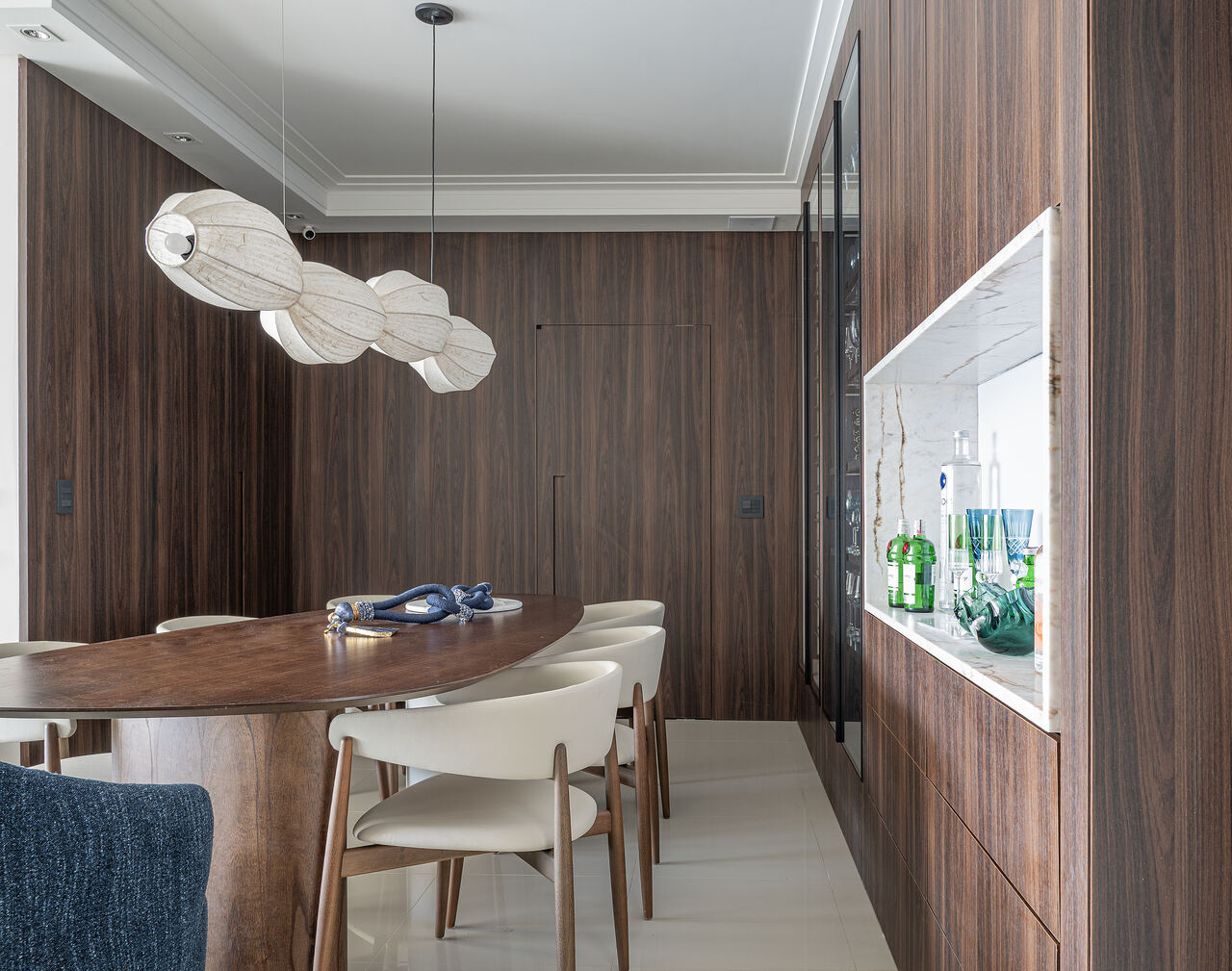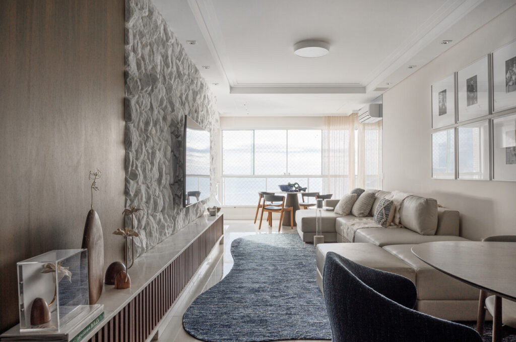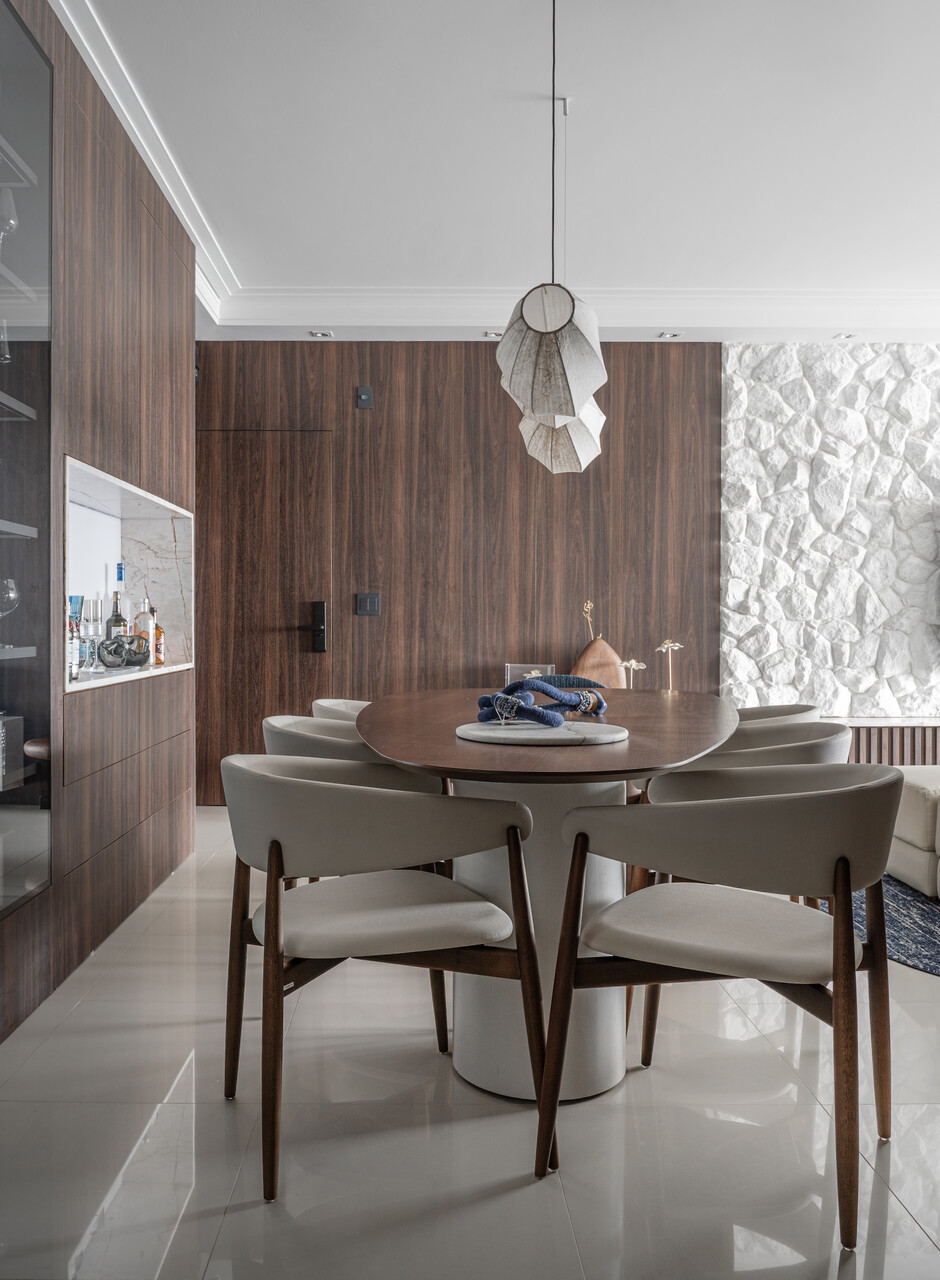 Um living elegante e acolhedor, onde a paleta neutra ganha profundidade com o contraste do azul e da madeira. O layout integrado valoriza a convivência, conectando estar, jantar e bar de forma fluida e sofisticada. O painel amadeirado com adega iluminada traz protagonismo e personalidade, enquanto o mobiliário de linhas orgânicas e texturas suaves reforça o conforto. A iluminação pendente sobre a mesa atua como elemento escultural, criando um ponto focal que equilibra modernidade e aconchego no ambiente.