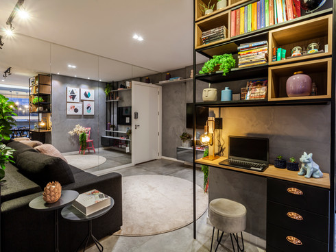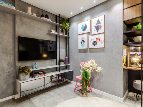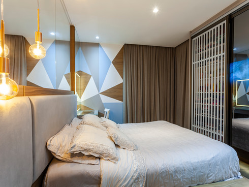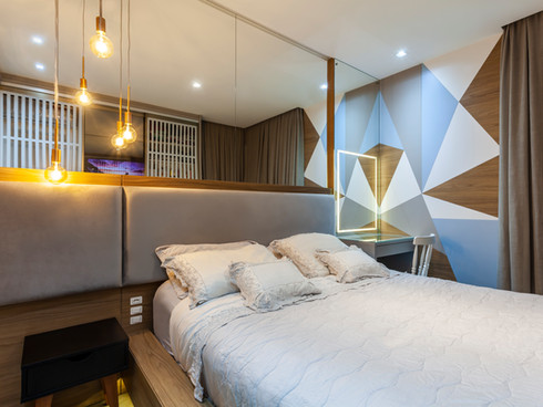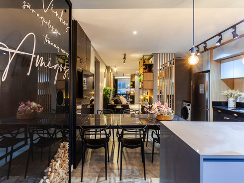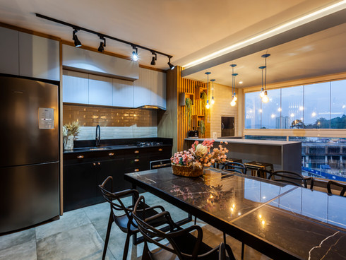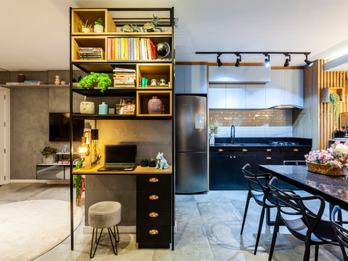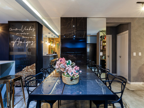 Neste projeto abordamos o estilo industrial com elementos contemporâneos que conversam entre si. A concepção da materialidade levou em consideração os ideais de uma residência que relembrasse o âmbito urbano. Destaque para a cozinha azul e preta e o painel geométrico na suíte.